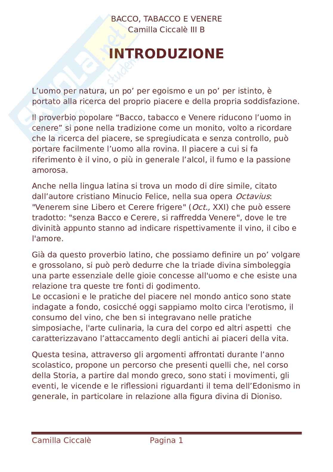 La mia tesina verte sull'edonismo. L’uomo per natura, un po’ per egoismo e un po’ per istinto, è portato alla ricerca del proprio piacere e della propria soddisfazione. Il proverbio popolare “Bacco, tabacco e Venere riducono l’uomo in cenere” si pone nella tradizione come un monito, volto a ricordare che la ricerca del piacere, se spregiudicata e senza controllo, può portare facilmente l’uomo alla rovina. Il piacere a cui si fa riferimento è il vino, o più in generale l’alcol, il fumo e la passione amorosa.Anche nella lingua latina si trova un modo di dire simile, citato dall’autore cristiano Minucio Felice, nella sua opera Octavius: "Venerem sine Libero et Cerere frigere" (Oct., XXI) che può essere tradotto: "senza Bacco e Cerere, si raffredda Venere", dove le tre divinità appunto stanno ad indicare rispettivamente il vino, il cibo e l'amore.