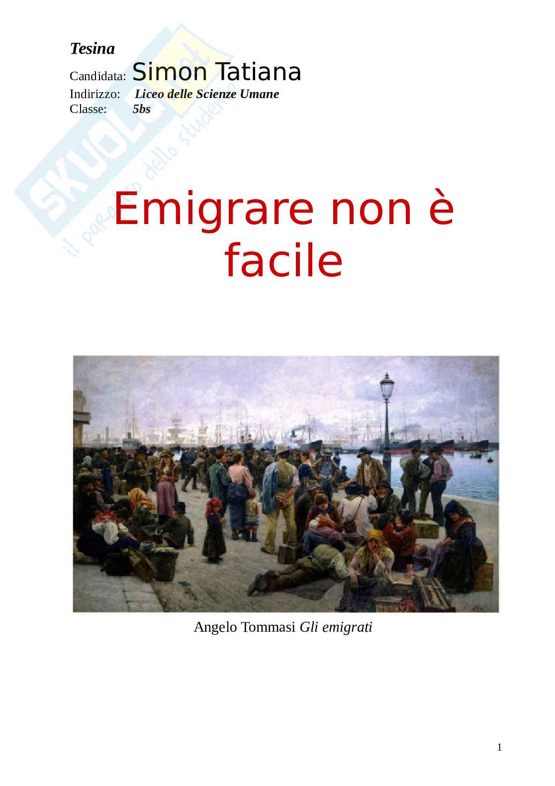 Tutto è mutato e niente è più come prima. Emigrare non significa solo prendere e andare alla ricerca di fortuna, ma vuol dire abbandonare tutto per necessità o per scelta e sperare di trovare una vita migliore. Là dove sei nato c’è tutta la tua vita, ma ormai è una vita che appartiene al passato, che non ha più futuro e allora decidi di andare altrove. E cosi si parte verso l’ignoto anche se sai il nome della città o almeno del paese dove vai, ma non sai nulla sull’anima di quel luogo, non sai se sarai ben accetto, non sai se ti integrerai e hai paura di perdere la tua identità, di perdere quello che eri fino a prima di uscire di casa ed incamminarsi verso una nuova vita senza guardare indietro. La tesina permette anche dei collegamenti alle varie materie scolastiche.