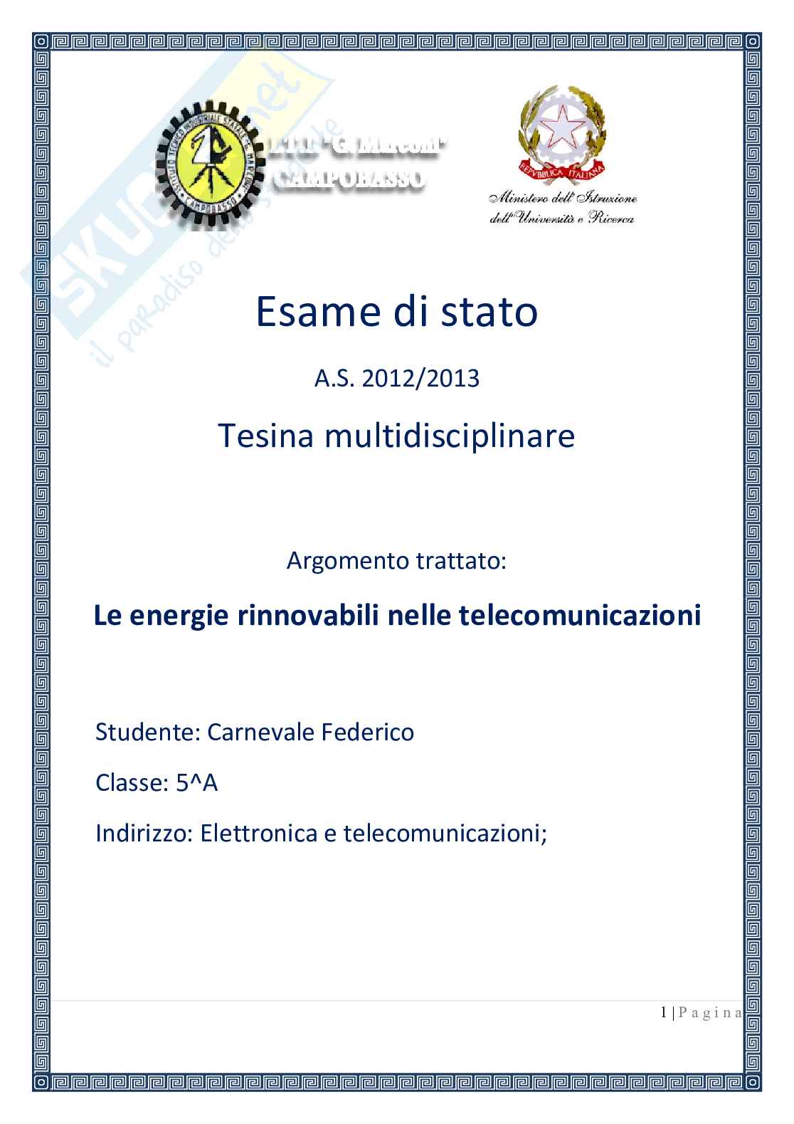 La seguente tesina di maturità descrive le energie rinnovabili nelle telecomunicazioni. La tesina permette inoltre dei collegamenti interdisciplinari con le seguenti materie: in Inglese vengono analizzate le energie rinnovabili nelle telecomunicazioni, il telefono cellulare; in Telecomunicazioni la modulazione PCM-TDM, in Elettronica il convertitore A/D ad aprossimazioni successive; in Sistemi automatici invece viene presa in esame la teoria del campionamento, la costruzione di un pannello fotovoltaico in TDP.