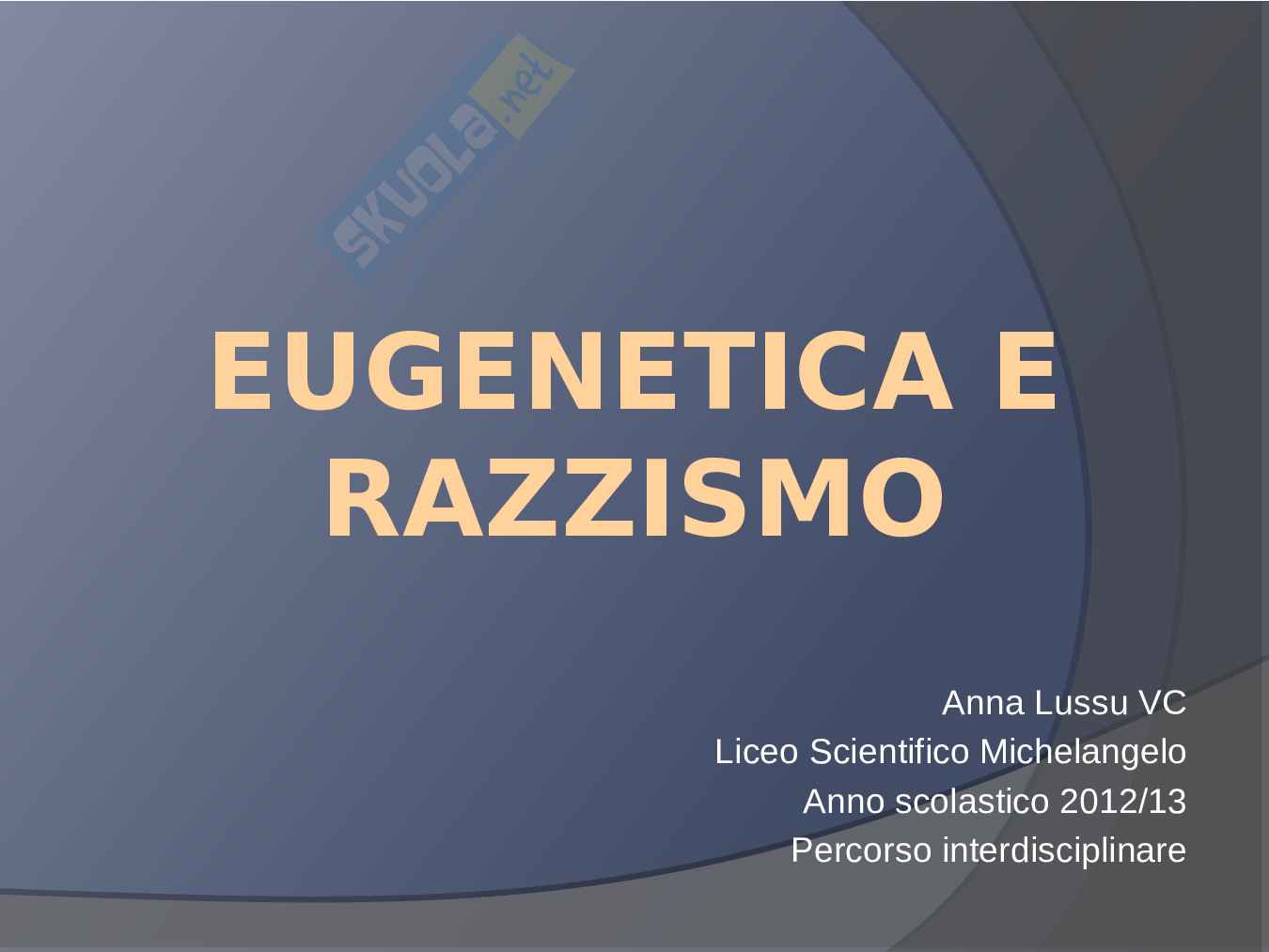 Questa tesina di maturità descrive l'eugenetica e il razzismo. La tesina maturità scientifica permette i seguenti collegamenti disciplinari: in Storia la storia dell'eugenetica, l'operazione T4; Leggi razziali in Germania e in Italia, in Letteratura latina Tacito, passo dei Germania, in Filosofia Nietzsche: nazificazione e denazificazione, in Letteratura inglese To Kill a mockingbird by Harper Lee e in Letteratura italiana Umberto Saba.