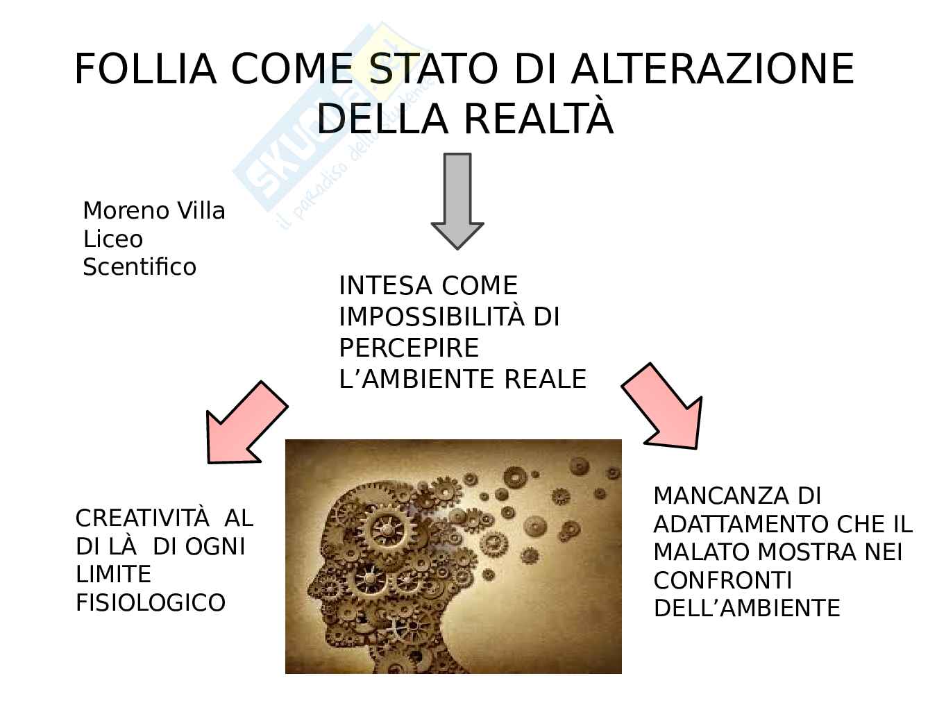 Questa tesina di maturità descrive la follia, tra realtà e creatività. GLi argomenti che la tesina sviluppa sono i seguenti: in Filosofia Sigmund Freud e la psicoanalisi, in Storia dell'arte il surrealismo e Salvadòr Dalì, in Italiano "La Coscienza di Zeno", Italo Svevo; Luigi Pirandello, "Enrico IV, in Latino, Seneca, "Il Furor" e l'età neroniana, in Inglese "Animal Farm" di George Orwell, in Storia la la maniacalità al potere: il nazismo, in Geografia astronomica l'orgine e l'evoluzione dell'universo di Fred Moyes, in Fisica il flusso del campo elettrico e il teorema di Gauss, in Matematica i limiti tendenti all'infinito.