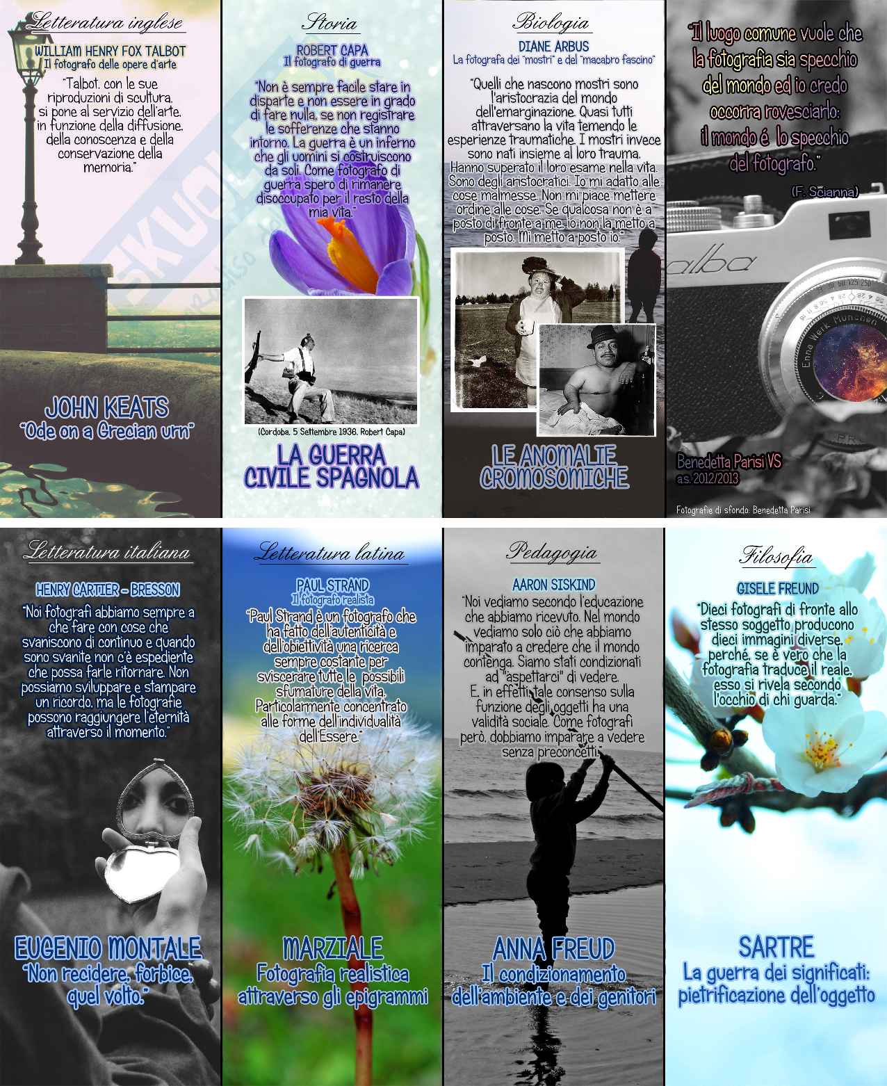 In questa tesina di maturità l'obiettivo è l'analisi della fotografia che spesso di afferma sia lo specchio della vita, ma molti spesso si chiedono se questo sia vero. La fotografia può essere descritta in modo del tutto particolare attraverso gli Epigrammi di Marziale, autore latino: si tratta di una fotografia realistica. In ambito letterario è effettuato un collegamento con la poesia di Montale, "Non recidere, forbice, quel volto"; la fotografia è molto importante anche grazie alle testimonianze fotografiche di Robert Capa, che effettua degli scatti sulla guerra civile spagnola.