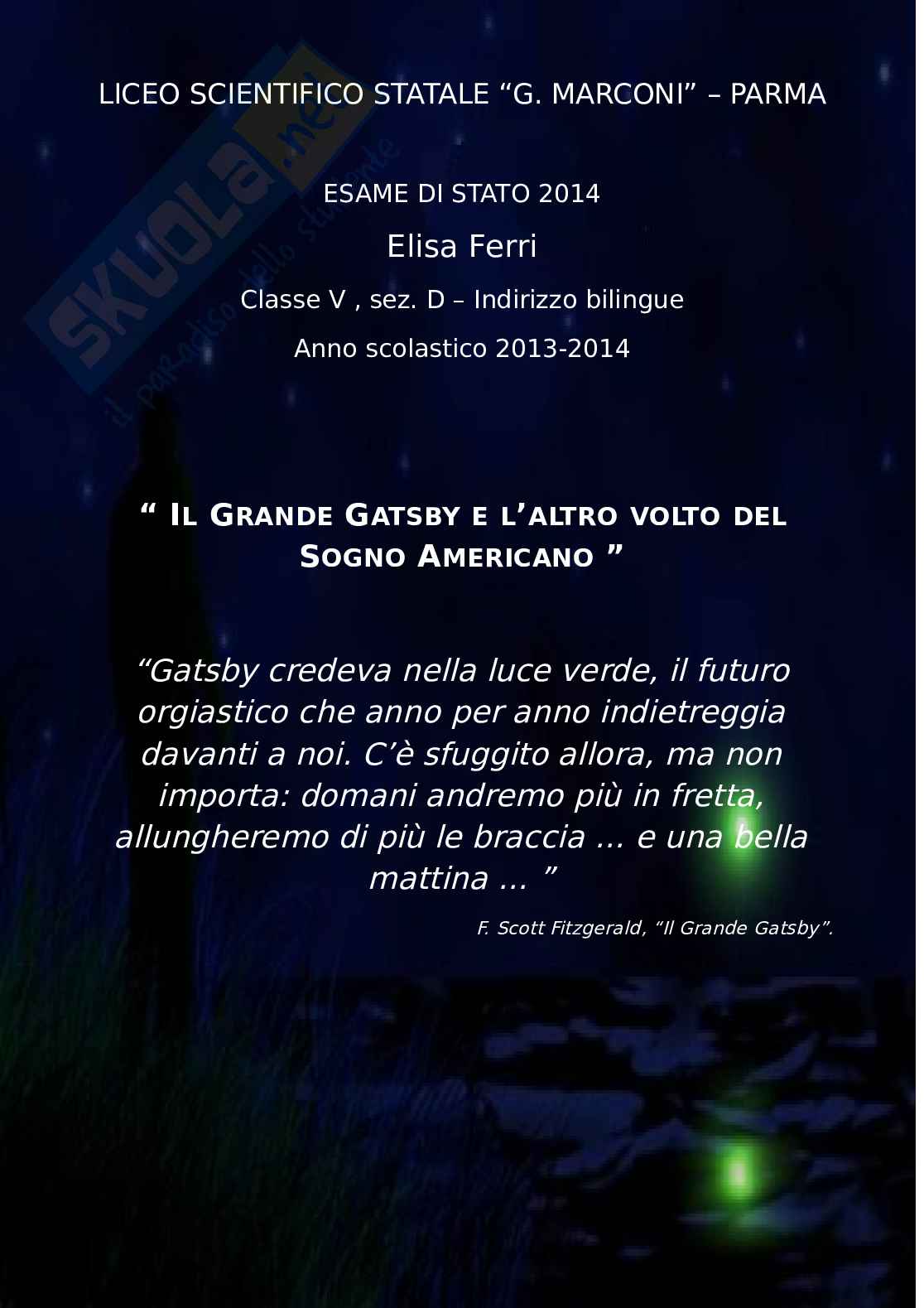 L’argomento centrale della mia tesina è il romanzo di F. Scott Fitzgerald “Il Grande Gatsby”. Il motivo di questa scelta per la mia tesina di maturità è molto semplice e sta nella mia passione per gli Stati Uniti d’America, la loro storia e la multiculturalità che li caratterizza. “Il Grande Gatsby” è espressione di uno dei momenti più entusiasmanti della storia americana, gli anni Venti, un’epoca che mi ha affascinata sotto tutti i punti di vista e che Fitzgerald analizza esaltandone pregi e senza tralasciarne i difetti. Presentato sotto la maschera di una storia d’amore, questo romanzo è in realtà molto di più della vicenda di due innamorati e solo andando a fondo, analizzando il contesto storico in cui è ambientato, cercando il simbolismo al suo interno, si può capire ciò che davvero l’autore vuole fare emergere: la storia di una società e del suo sogno.