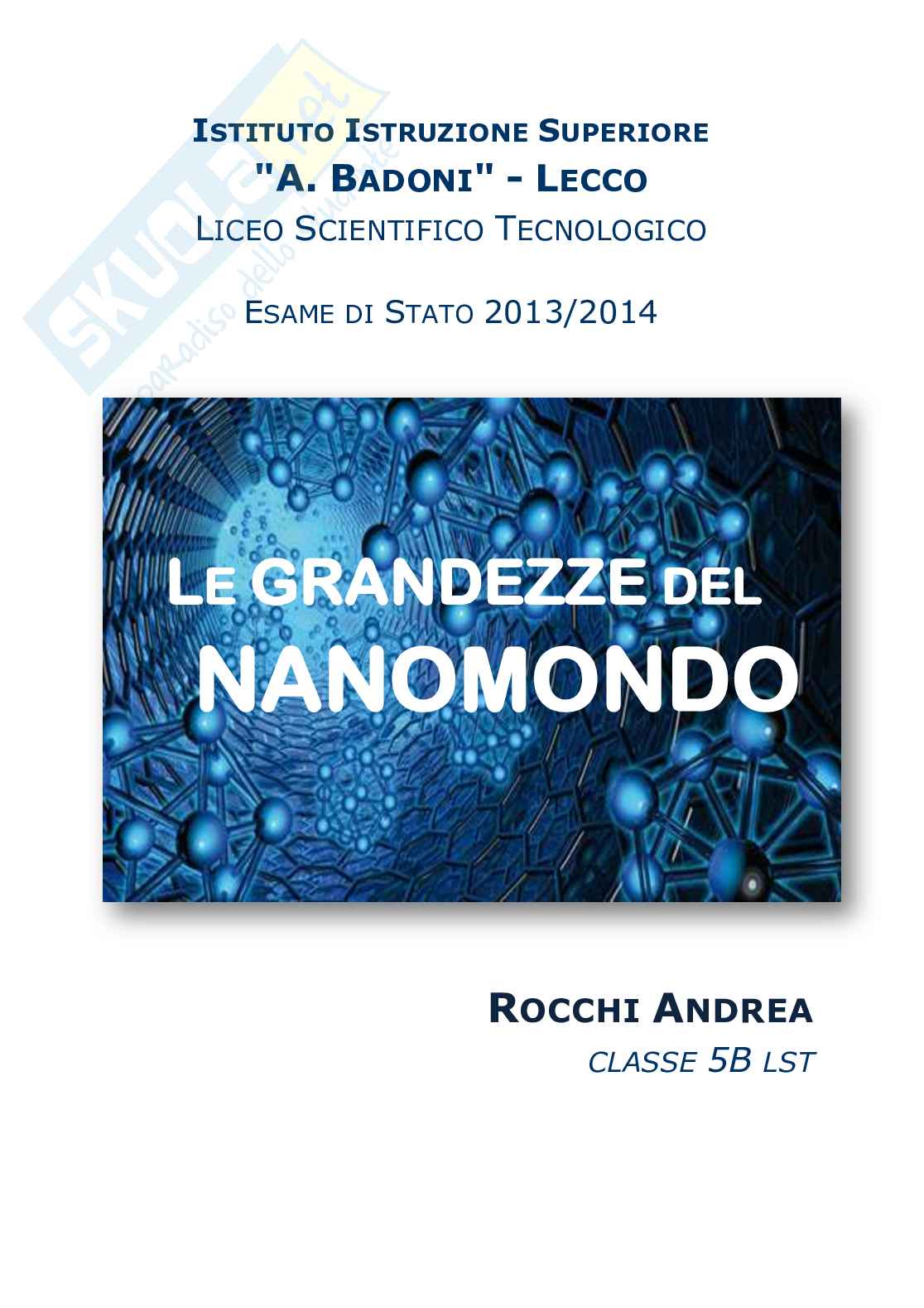 La seguente tesina di maturità tratta del tema delle grandezze del nanomondo. Cosa sono le nanotecnologie? Spesso si fa confusione tra nanotecnologia e microtecnologia ma in realtà le nanotecnologie rappresentano una vera rivoluzione a livello scientifico e sociale, destinata a cambiare radicalmente la vita di tutti i giorni in un futuro che è ormai presente. Ufficialmente non esiste una definizione universalmente accettata dalla comunità scientifica; in generale è possibile affermare che le nanotecnologie rappresentano il controllo e la manipolazione della materia su scala dimensionale inferiore al micrometro (normalmente tra 1 e 100 nanometri).