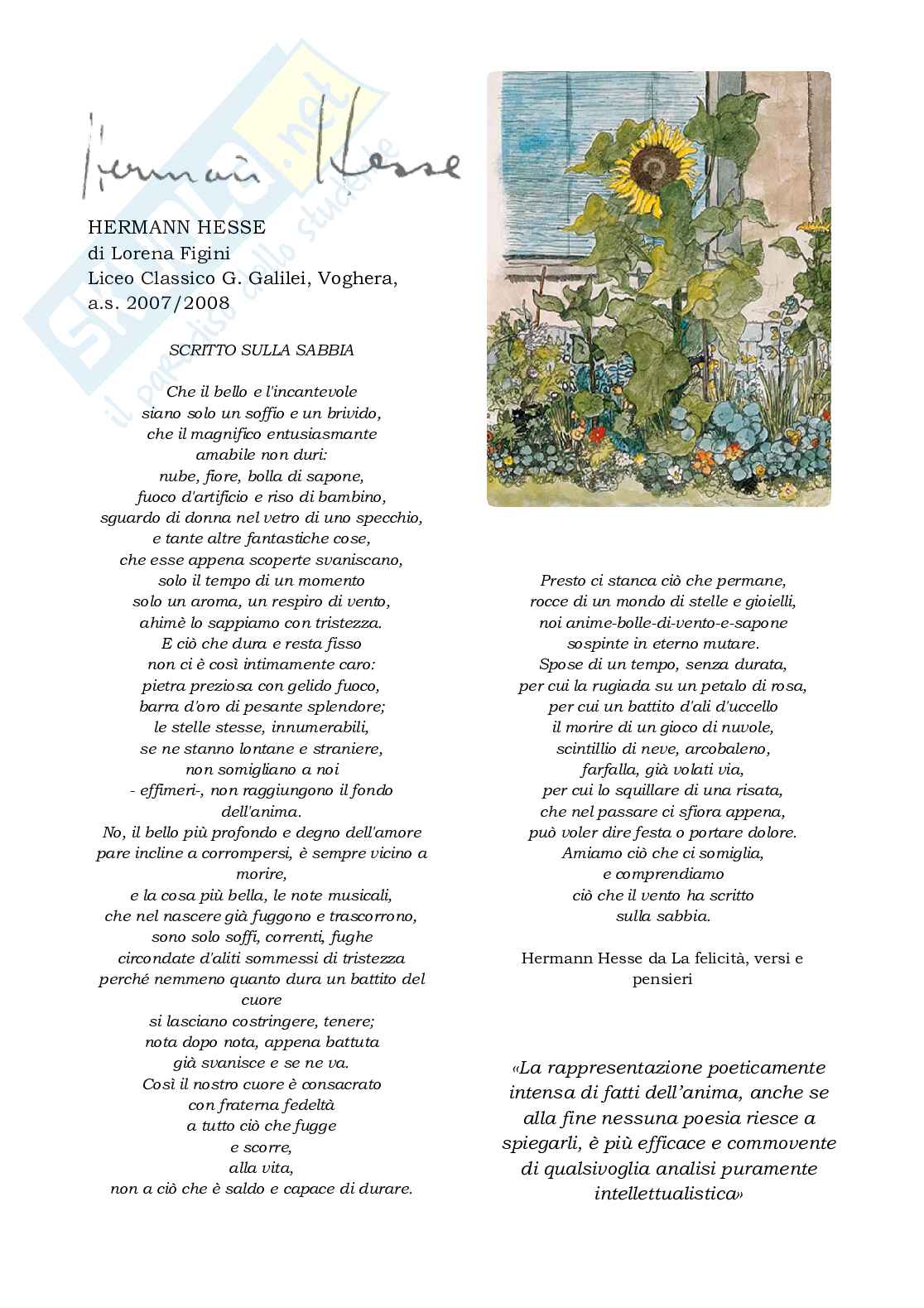 Sommario: Hermann Hesse nasce a Calw, cittadina della Foresta Nera, nel 1877. La sua famiglia rappresenta un insieme di influenze diverse: il padre è cittadino russo, la madre, tedesca con origini francesi, è nata in India, il nonno è missionario e poliglotta. Hermann cresce, dunque, all'ombra della grande libreria paterna, in un ambiente familiare ricco di stimoli nei quali si fondono l'insegnamento biblico (di impronta pietista), lo studio della filosofia e quello dei costumi indiani. L'analisi della famiglia da cui proviene ci permette di comprendere a fondo la produzione artistica di questo autore sempre fedele, nella sua produzione letteraria e non (ricordiamo anche l'esperienza come pittore), al principio di superiorità dell'esperienza sensibile su quella intellettuale. Destinato a studi teologici, Hermann ha con la scuola un rapporto complicato, fatto di sofferenze, delusioni e costanti ribellioni. Il giovane predilige la cultura libera, dichiarando di aver letto, durante gli anni scolastici, "metà della letteratura mondiale". Lavora come apprendista orologiaio, come bibliotecario, viaggia e si appassiona all'Italia, alla figura di Francesco di Assisi, all'India e alla cultura orientale. Durante la Grande Guerra si schiera per la pace e lavora presso un centro di assistenza ai prigionieri di guerra. Ottenuta la cittadinanza svizzera, si trasferisce a Montagnola, nel Canton Ticino, luogo che diventerà per lui rifugio, oltre che fisico, anche intellettuale. Durante la dittatura hitleriana si adopera per aiutare profughi e perseguitati. Riceve il Premio Nobel nel 1946 e muore nella "sua" Montagnola nel 1962. Hermann Hesse pensava di essere uno scrittore, non un uomo politico. All'inizio della Prima Guerra Mondiale fu uno dei pochi intellettuali che non si unirono all'entusiasmo generale per la guerra. Infatti, la maggior parte degli intellettuali si schierò a favore delle operazioni belliche; tra essi è da ricordare Thomas Mann, che si espresse a favore della guerra nello scritto ("Considerazioni di un apolitico") sul conflitto tra Kultur e Zivilisation (posizione poi abbandonata in favore di una sostanziale opposizione alla guerra, com'è riscontrabile anche in un carteggio con lo stesso Hermann Hesse). É pur vero che Hesse non aveva uno spirito nazionalistico forte; infatti, le sue origini di così varia natura gli avevano permesso di vedere la Germania con occhio distaccato.