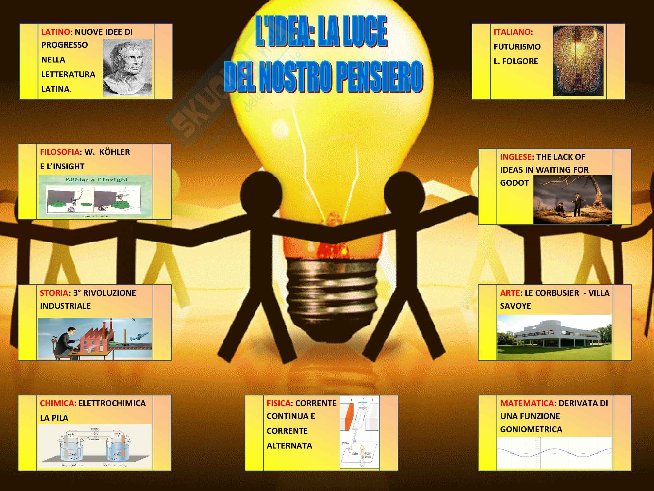 Gli uomini essendo mortali per loro natura vanno e vengono ("passano") cioè possono morire. Al contrario le idee da loro espresse, quelle buone, vivono per sempre ("restano"). Vivono per sempre nella coscienza ("nelle gambe") di altre persone che seguono l'esempio da loro dato. Simbolo dell’idea è certamente la lampadina, la quale si accende metaforicamente nella nostra mente sotto forma di “insight”, ossia intuizione, come affermava il filosofo Köhler; mentre per accendersi nella realtà ha bisogno di un generatore di corrente elettrica, come per esempio la pila. La tesina di maturità permette anche il collegamento con le varie materie scolastiche.