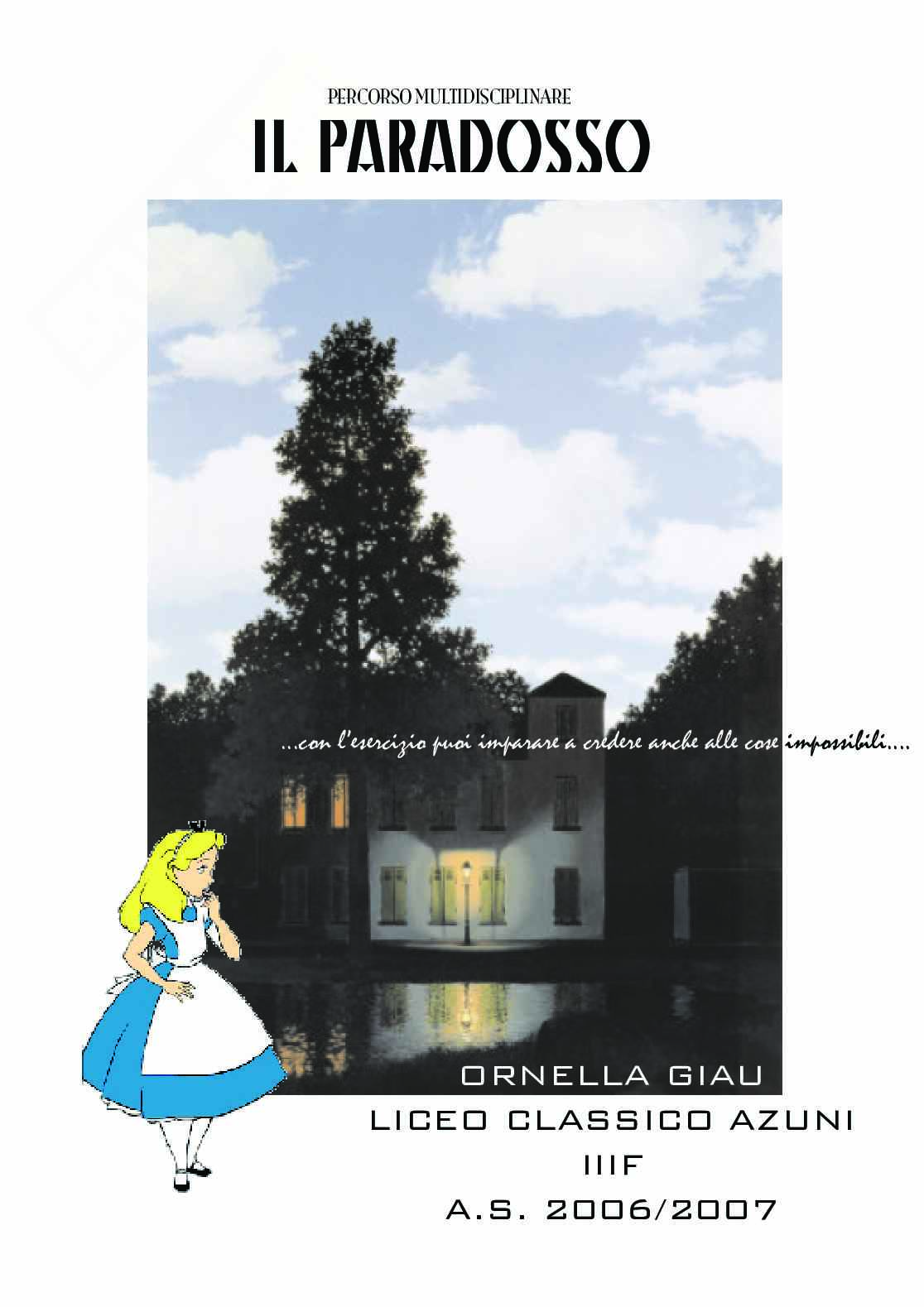 Ho analizzato il tema del paradosso partendo col tracciarne le caratteristiche filosofiche, in particolare nella filosofia kierkegaardiana in contrapposizione all'idealismo. In ambito artistico mi sono ricollegata alla pittura di Magritte caratterizzata