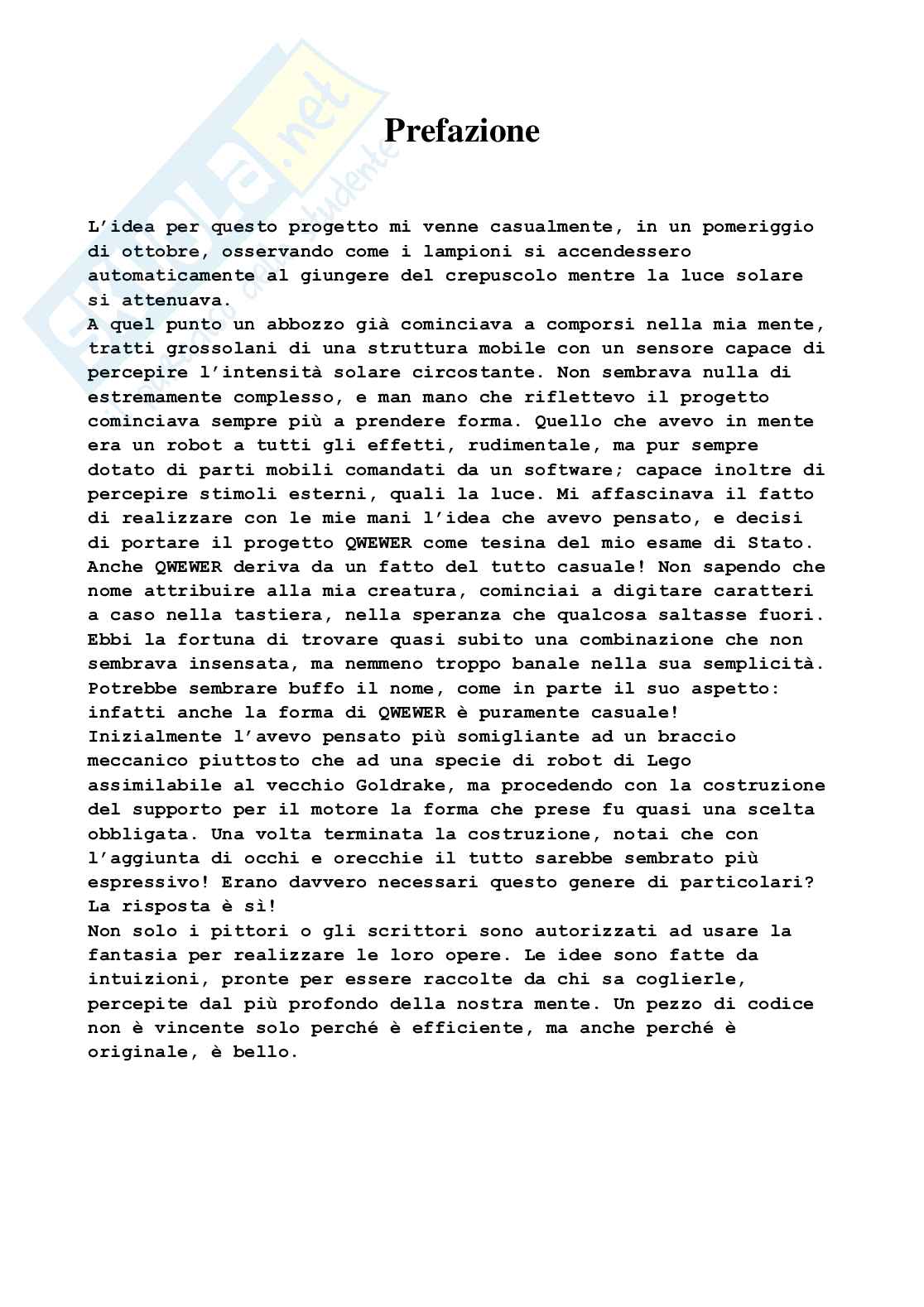 L'idea per questo progetto mi venne casualmente, in un pomeriggio di ottobre, osservando come i lampioni si accendessero automaticamente al giungere del crepuscolo mentre la luce solare si attenuava. A quel punto un abbozzo già cominciava a comporsi nella mia mente, tratti grossolani di una struttura mobile con un sensore capace di percepire l'intensità solare circostante. Non sembrava nulla di estremamente complesso, e man mano che riflettevo il progetto cominciava sempre più a prendere forma. Quello che avevo in mente era un robot a tutti gli effetti, rudimentale, ma pur sempre dotato di parti mobili comandati da un software; capace inoltre di percepire stimoli esterni, quali la luce. Mi affascinava il fatto di realizzare con le mie mani l'idea che avevo pensato, e decisi di portare il progetto QWEWER come tesina del mio esame di Stato. Anche QWEWER deriva da un fatto del tutto casuale! Non sapendo che nome attribuire alla mia creatura, cominciai a digitare caratteri a caso nella tastiera, nella speranza che qualcosa saltasse fuori. Ebbi la fortuna di trovare quasi subito una combinazione che non sembrava insensata, ma nemmeno troppo banale nella sua semplicità . Potrebbe sembrare buffo il nome, come in parte il suo aspetto: infatti anche la forma di QWEWER è puramente casuale!