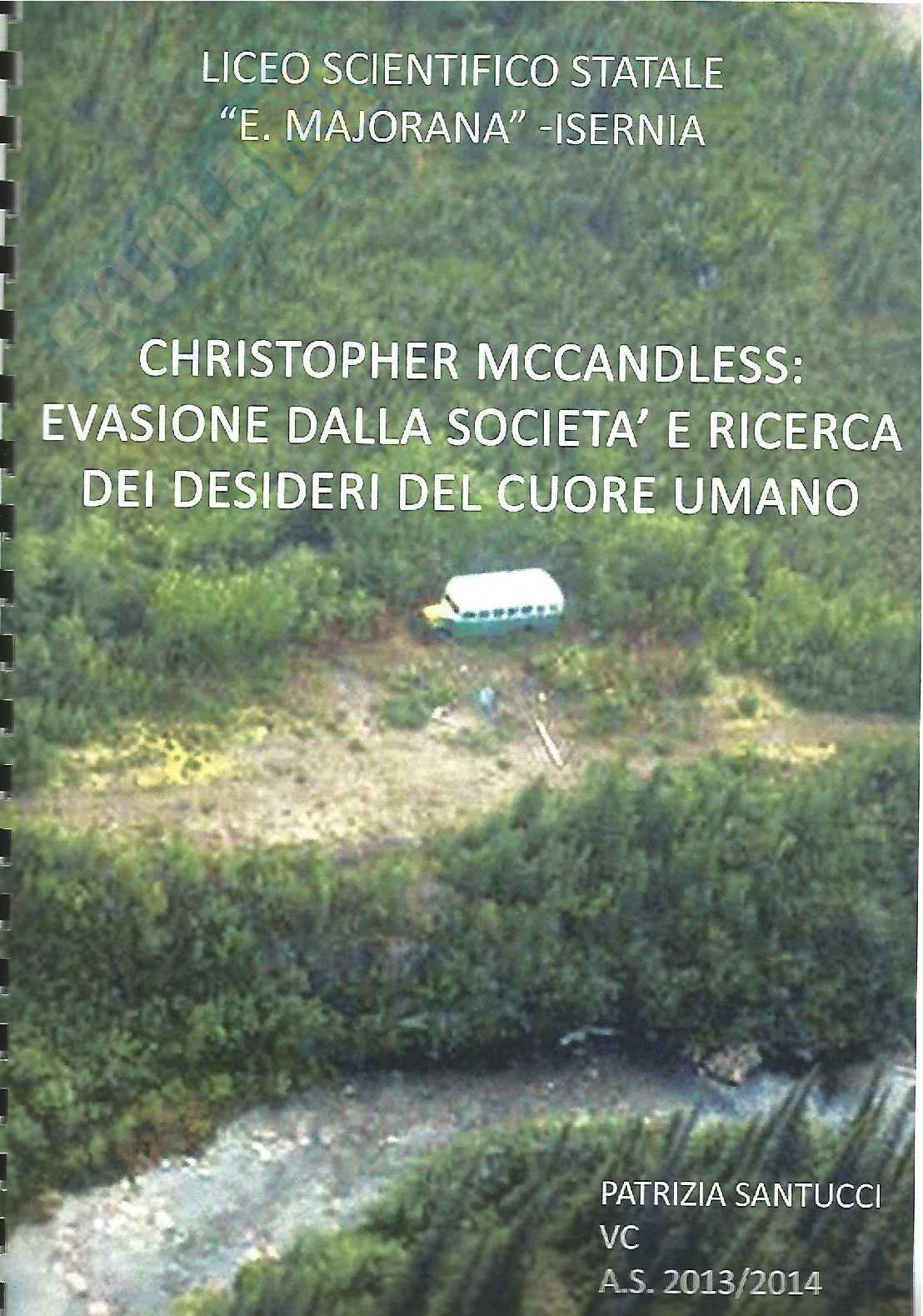 La seguente tesina di maturità tratta del film Into the Wild. La tesina abbraccia anche i seguenti argomenti nella varie discipline scolastiche: the byronic hero in Inglese; la concezione di industrializzazione come processo di massificazione e alienazione in Storia; il "secessus" e l' "otium" in Seneca in Latino; la natura e l' uomo in Schelling in Filosofia; Friedrich Storia dell'Arte; i limiti in Matematica; la Luna in Geografia Generale; "Il fu Mattia Pascal" di Pirandello in Italiano.