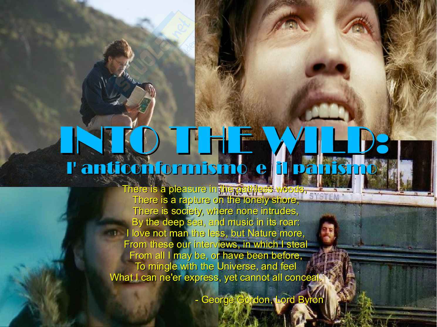 Questa tesina di maturità descrive l'anticonformismo e il panismo attraverso Into the wild. Gli argomenti che vengono sviluppati nella tesina sono i seguenti: in Storia il 1968, in Inglese Jack Keruac e la Beat Generation, in Italiano l'anticonformismo nel 1900. Dagli scapigliati ai decadenti, La trappola di Pirandello, in Filosofia il nichilismo attivo di Nietzsche e la volontà di potenza di Schopenhauer, in Fisica l'entropia, un concetto fisico legato al mondo dionisiaco, in Latino Petronio, il Satyricon e il percorso labirintico dei personaggi, in Greco Luciano e "La storia vera", in Geografia astronomica Galileo Galilei,