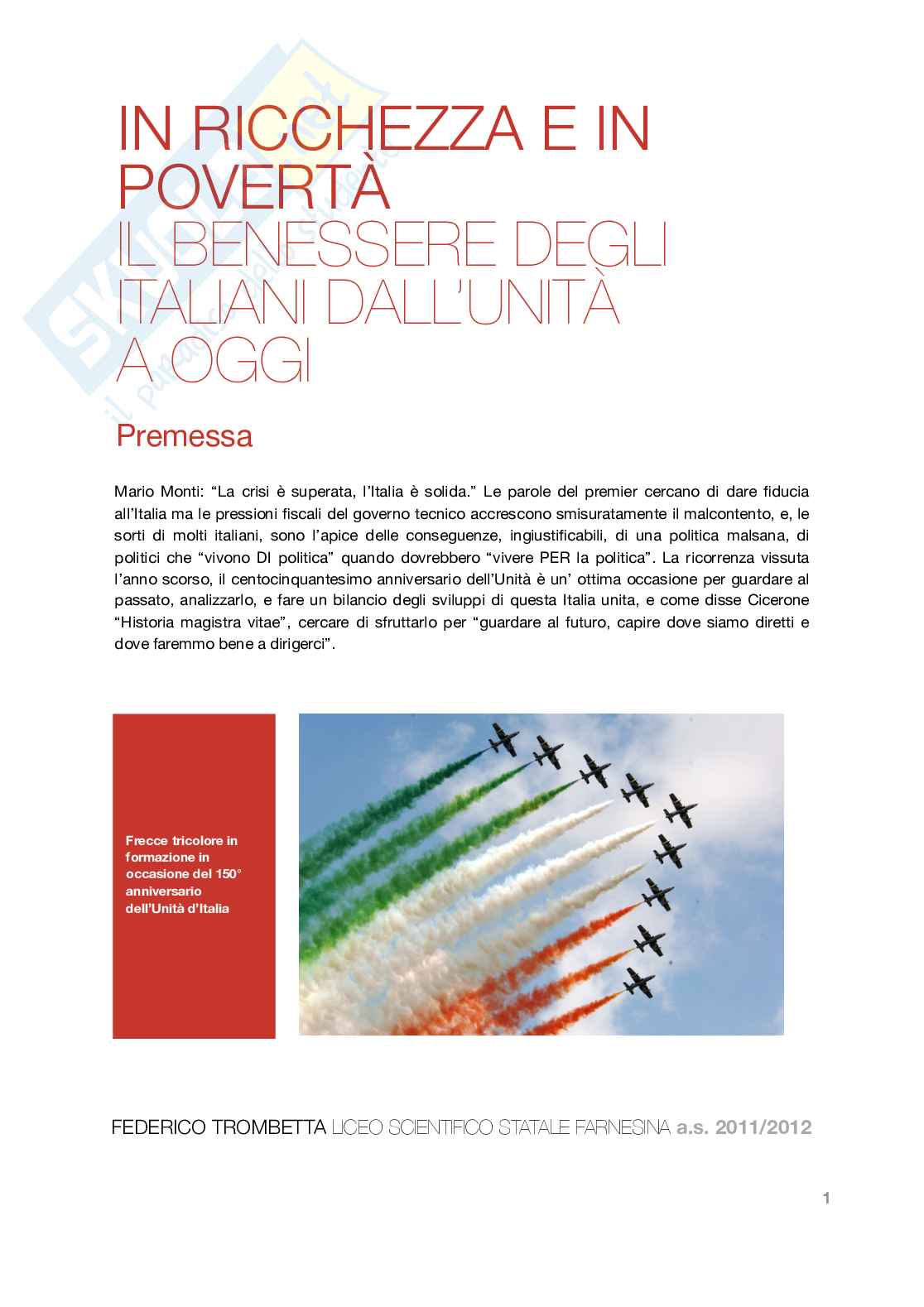 La seguente tesina ha come obiettivo quello di descrivere l'Italia dall'Unità ai tempi odierni, effettuando dei collegamenti interdisciplinari. Mario Monti: “La crisi è superata, l’Italia è solida.” Le parole del premier cercano di dare fiducia all’Italia ma le pressioni fiscali del governo tecnico accrescono smisuratamente il malcontento, e, le sorti di molti italiani, sono l’apice delle conseguenze, ingiustificabili, di una politica malsana, di politici che “vivono DI politica” quando dovrebbero “vivere PER la politica”. La ricorrenza vissuta l’anno scorso, il centocinquantesimo anniversario dell’Unità è un’ ottima occasione per guardare al passato, analizzarlo e fare un bilancio degli sviluppi di questa Italia unita, e come disse Cicerone “Historia magistra vitae”, cercare di sfruttarlo per “guardare al futuro, capire dove siamo diretti e dove faremmo bene a dirigerci”. La tesina di maturità inoltre mostra anche la storia del Paese a partire dalla formazione del Regno unitario.