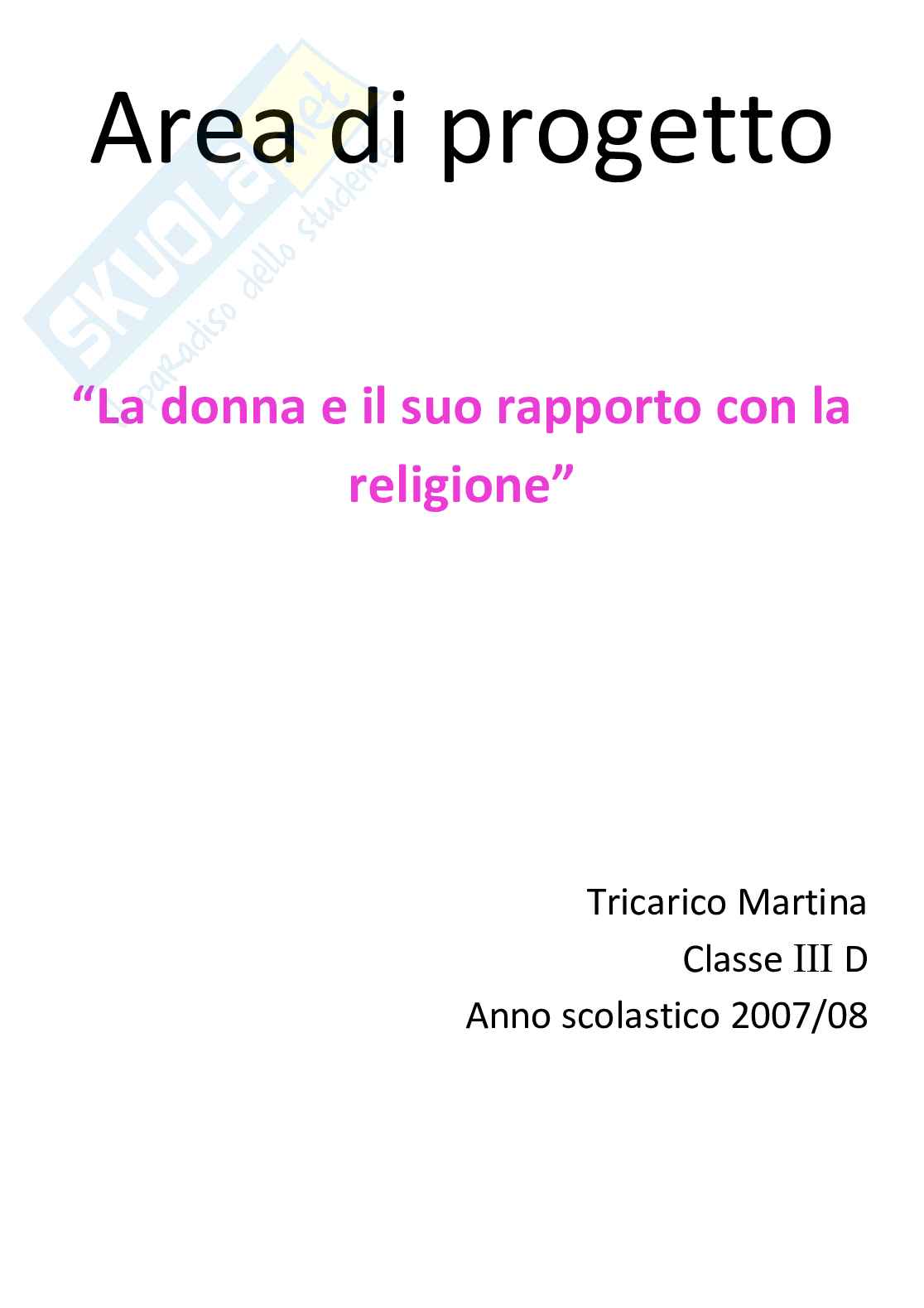 Sommario: Ho scelto di sviluppare la mia area di progetto sul tema della donna e il suo rapporto con la religione in quanto credo che ogni tipo di credenza, devozione o rifiuto per una forma di quest'ultime, costituisca un aspetto importante della vita di una persona in quanto contribuisce a formare quelle che sono le caratteristiche proprie di una persona