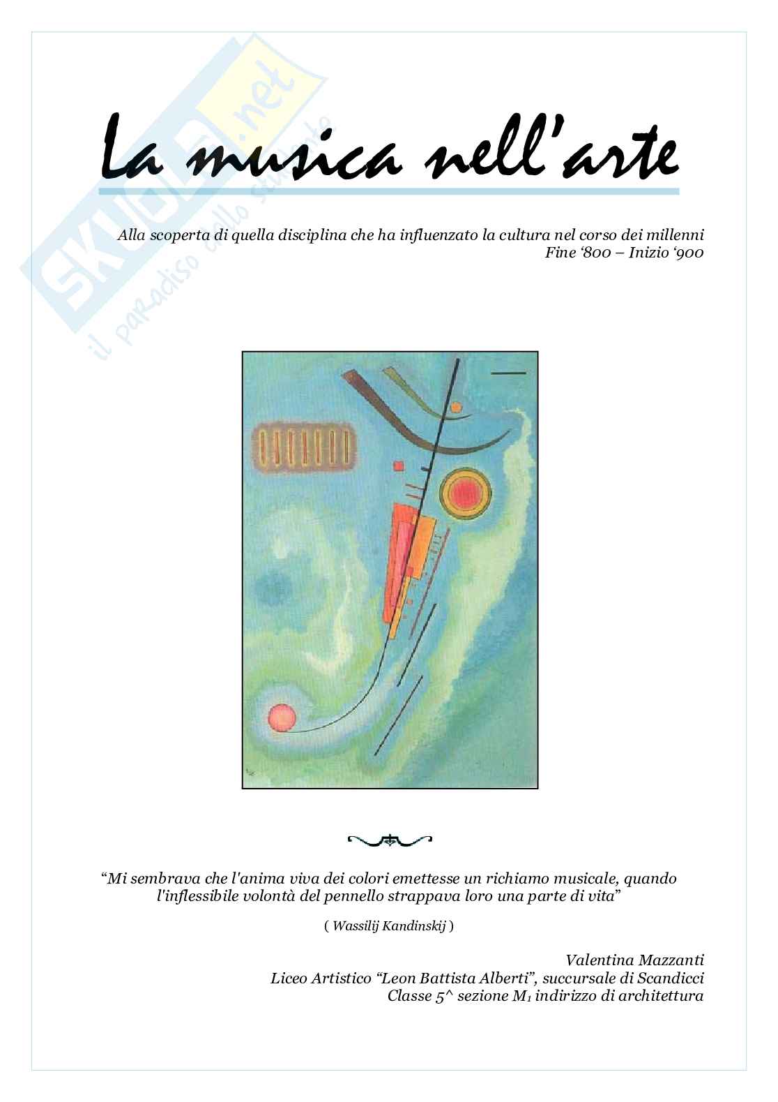 Sommario: La musica nell'arte Alla scoperta di quella disciplina che ha influenzato la cultura nel corso dei millenni Fine "800 ââ¬" Inizio "900 "Mi sembrava che l'anima viva dei colori emettesse un richiamo musicale, quando l'inflessibile volontà del pennello strappava loro una parte di vita" ( Wassilij Kandinskij ) Valentina Mazzanti Liceo Artistico "Leon Battista Alberti", succursale di Scandicci Classe 5^ sezione M1 indirizzo di architettura La musica è sempre stata una delle discipline artistiche che ha maggiormente influenzato la cultura; dalla letteratura, all'arte, fino alla filosofia. Questa disciplina antichissima affonda le sue radici già nell'era preistorica, per svilupparsi via via nel corso dei secoli, culminare in età romantica con i grandi come il celebre Ludwig Van Beethoven ( anche se pre-romantico, iniziò a comporre in chiave romantica già da fine "700 ) e Robert Schumann in Germania, e Vincenzo Bellini, Gioacchino Rossini e Giuseppe Verdi in Italia, fino ad arrivare ai giorni nostri. Prenderemo in esame lo sviluppo e l'influenza di quest'arte sublime tra fine 1800 e inizio 1900, analizzandone la sua importanza proprio nelle discipline sopra citate, quali arte, filosofia, storia e letteratura.