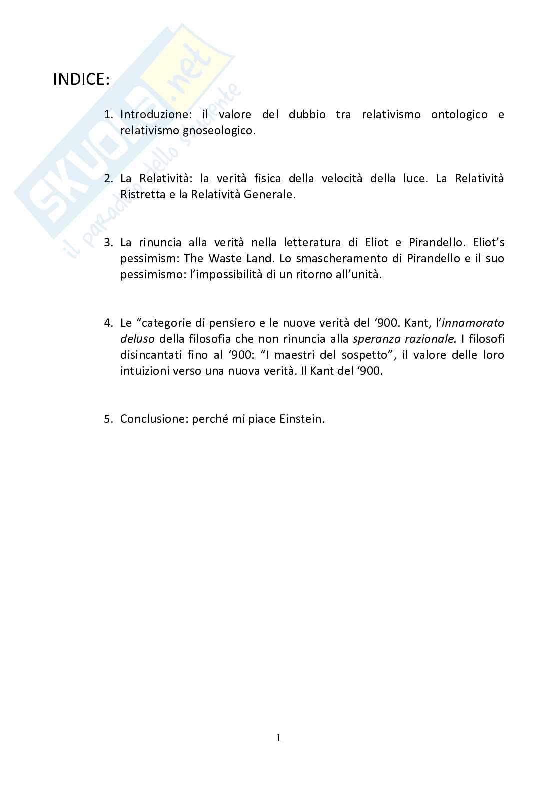 Sommario: Fisica: La teoria della Relativit di Einstein, la verit fisica della velocit della luce Inglese: Eliot, The Waste Land Italiano: Pirandello, Il fu Mattia Pascal, Uno, nessuno e centomila Filosofia: Kant, Critica della Ragion Pura, Critica della Ragion Pratica, Marx, la struttura e sovrastruttura, Nietzsche e la sua "scuola di sospetto", dalla "morte di Dio" alla figura del "superuomo", Freud e la scomposizione della psiche umana, Albert Einstein, con la sua Teoria della Relativit, Eliot e Pirandello. Filosofia: Kant