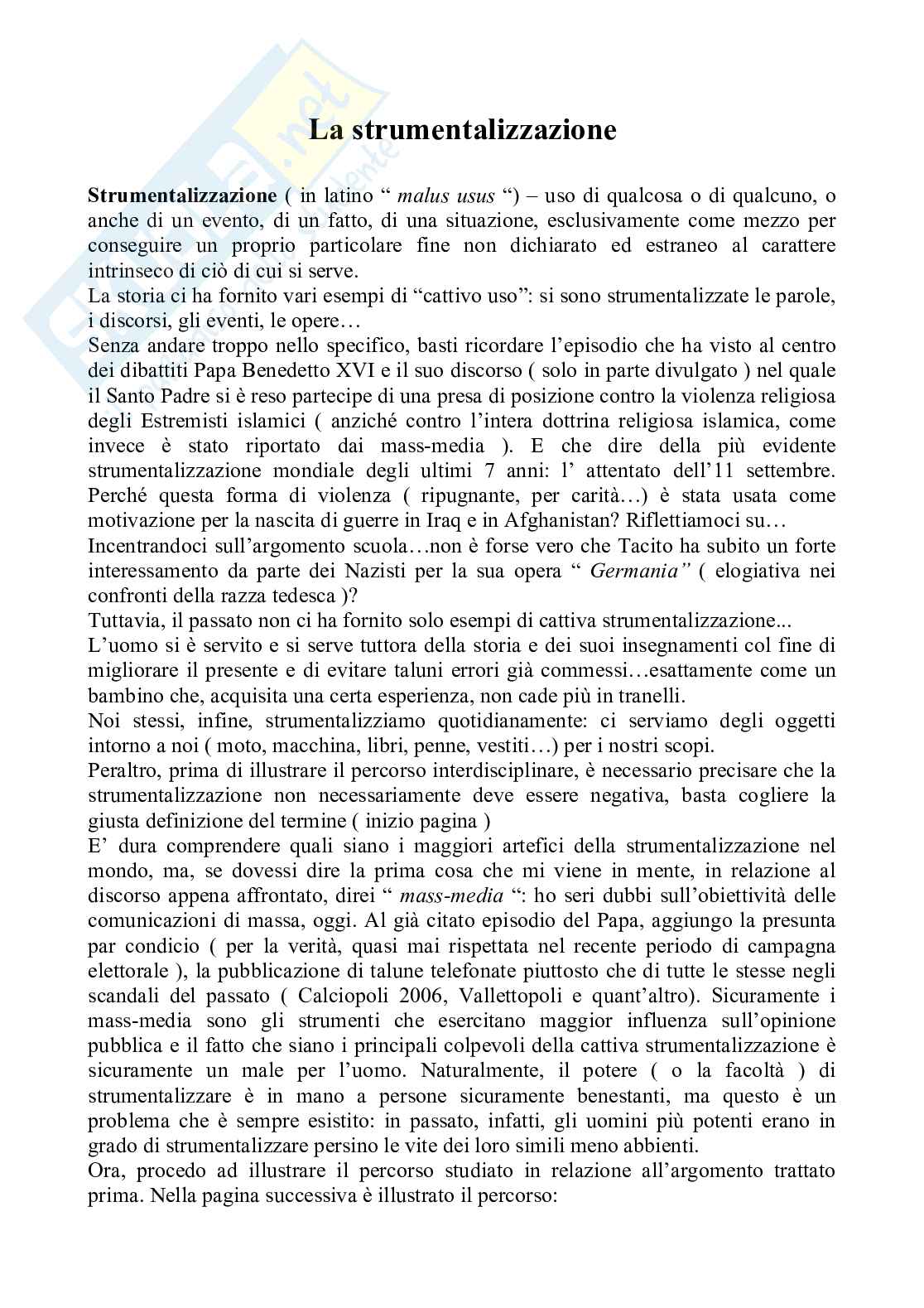 Sommario: Strumentalizzazione ( in latino " malus usus ") ââ¬" uso di qualcosa o di qualcuno, o anche di un evento, di un fatto, di una situazione, esclusivamente come mezzo per conseguire un proprio particolare fine non dichiarato ed estraneo al carattere intrinseco di ciò di cui si serve. La storia ci ha fornito vari esempi di "cattivo uso": si sono strumentalizzate le parole, i discorsi, gli eventi, le opereâ⬦ Senza andare troppo nello specifico, basti ricordare l'episodio che ha visto al centro dei dibattiti Papa Benedetto XVI e il suo discorso ( solo in parte divulgato ) nel quale il Santo Padre si è reso partecipe di una presa di posizione contro la violenza religiosa degli Estremisti islamici ( anziché contro l'intera dottrina religiosa islamica, come invece è stato riportato dai mass-media ). E che dire della più evidente strumentalizzazione mondiale degli ultimi 7 anni: l' attentato dell'11 settembre. Perché questa forma di violenza ( ripugnante, per carità â⬦) è stata usata come motivazione per la nascita di guerre in Iraq e in Afghanistan? Riflettiamoci suâ⬦ Incentrandoci sull'argomento scuolaâ⬦non è forse vero che Tacito ha subito un forte interessamento da parte dei Nazisti per la sua opera " Germania" ( elogiativa nei confronti della razza tedesca )? Tuttavia, il passato non ci ha fornito solo esempi di cattiva strumentalizzazione... L'uomo si è servito e si serve tuttora della storia e dei suoi insegnamenti col fine di migliorare il presente e di evitare taluni errori già commessiâ⬦esattamente come un bambino che, acquisita una certa esperienza, non cade più in tranelli. Noi stessi, infine, strumentalizziamo quotidianamente: ci serviamo degli oggetti intorno a noi ( moto, macchina, libri, penne, vestitiâ⬦) per i nostri scopi. Peraltro, prima di illustrare il percorso interdisciplinare, è necessario precisare che la strumentalizzazione non necessariamente deve essere negativa, basta cogliere la giusta definizione del termine ( inizio pagina ) E' dura comprendere quali siano i maggiori artefici della strumentalizzazione nel mondo, ma, se dovessi dire la prima cosa che mi viene in mente, in relazione al discorso appena affrontato, direi " mass-media ": ho seri dubbi sull'obiettività delle comunicazioni di massa, oggi. Al già citato episodio del Papa, aggiungo la presunta par condicio ( per la verità , quasi mai rispettata nel recente periodo di campagna elettorale ), la pubblicazione di talune telefonate piuttosto che di tutte le stesse negli scandali del passato ( Calciopoli 2006, Vallettopoli e quant'altro).
