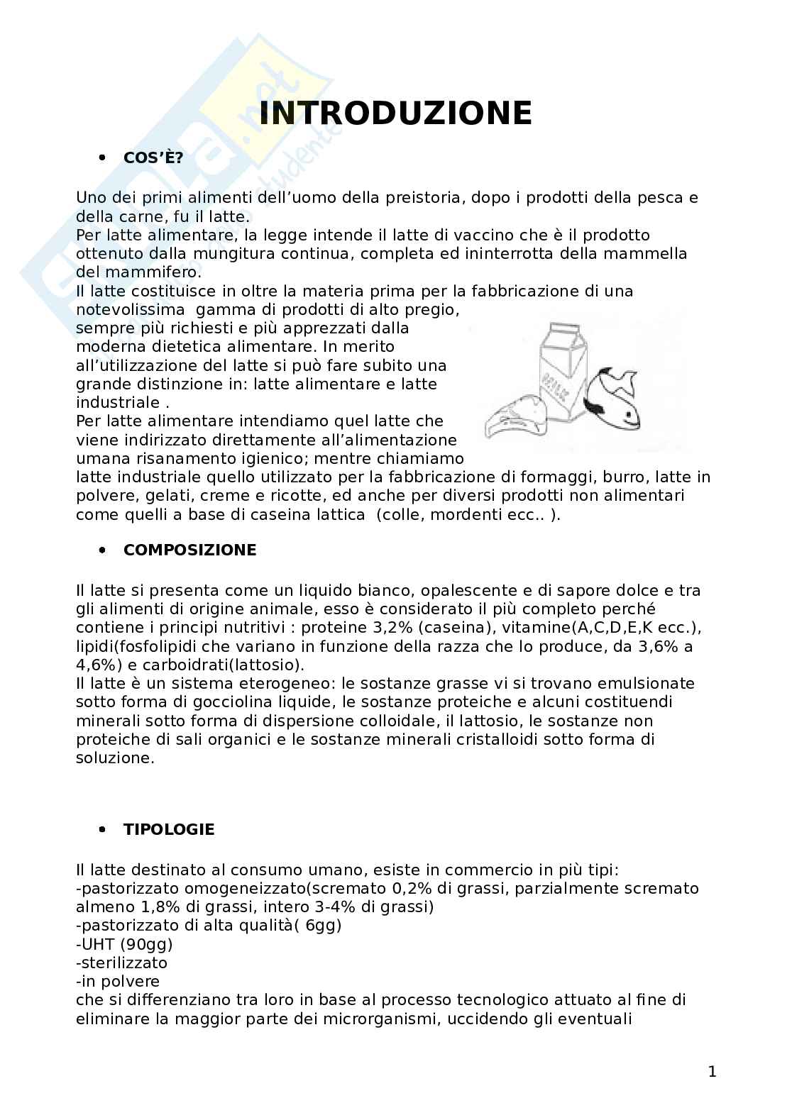 Questa tesina tratta del latte. Uno dei primi alimenti dell’uomo della preistoria, dopo i prodotti della pesca e della carne, fu il latte. Per latte alimentare, la legge intende il latte di vaccino che è il prodotto ottenuto dalla mungitura continua, completa ed ininterrotta della mammella del mammifero. Il latte costituisce in oltre la materia prima per la fabbricazione di una notevolissima gamma di prodotti di alto pregio, sempre più richiesti e più apprezzati dalla moderna dietetica alimentare. In merito all’utilizzazione del latte si può fare subito una grande distinzione in: latte alimentare e latte industriale . Per latte alimentare intendiamo quel latte che viene indirizzato direttamente all’alimentazione umana risanamento igienico; mentre chiamiamo latte industriale quello utilizzato per la fabbricazione di formaggi, burro, latte in polvere, gelati, creme e ricotte, ed anche per diversi prodotti non alimentari come quelli a base di caseina lattica (colle, mordenti ecc.. ). La tesina di maturità permette inoltre dei collegamenti con le altre materie scolastiche.