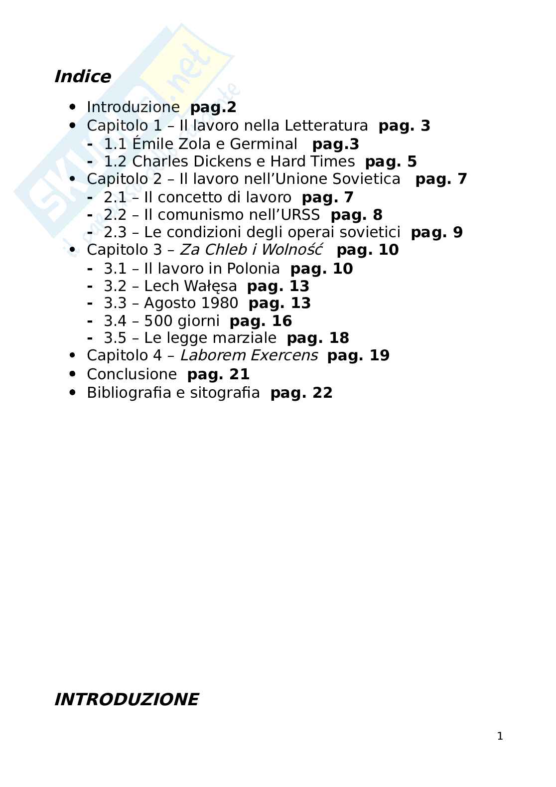 In un tempo in cui i diritti dei lavoratori sono subordinati alla volontà dei mercati, ho deciso di scrivere una tesina dedicata alla riflessione sulle condizioni, i sacrifici e le conquiste della classe operaia del Ventesimo Secolo con la speranza che anche le generazioni future possano avvalersi dei diritti per cui i loro nonni hanno lottato. Inoltre mi concentrerò sul valore del lavoro e, in particolare, sul quello attribuitogli dalla dottrina sociale cattolica. Innanzitutto rivolgerò la mia attenzione alle condizioni di lavoro di fine Ottocento e primo Novecento attraverso il loro riflesso nella letteratura europea, soffermandomi su quella francese con Zola e su quella inglese con Dickens. Successivamente nella mia tesina di maturità prenderò come esempio la situazione lavorativa nell’Unione Sovietica e le riflessioni di Marx su cui essa si basava. In seguito, osserverò il fondamentale ruolo del sindacato polacco Solidarność nell’ambito delle conquiste operaie, descrivendone la storia e i principi che lo animano. Ho scelto di dedicarmi in particolare alla situazione polacca sia per l’esempio che fu per l’Europa intera sia perché essa ha messo in atto concretamente i valori sociali cattolici che reputo particolarmente validi, soprattutto se inseriti nel clima di solidarietà della Polonia degli anni Ottanta. Infine, ho descritto brevemente la concezione del lavoro cattolica attraverso l’Enciclica Laborem Exercens.
