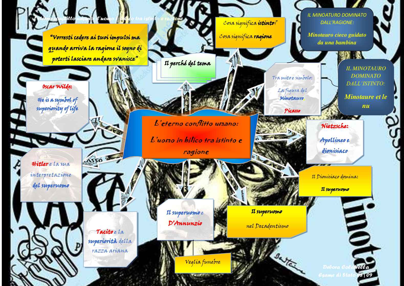 Sommario: Arte,Picasso,il minotauro,figura mitologica metà sitintiva metà razionale Fiolosofia,Nietzsche,Apollineo e dionisiaco Italiano,Decadentismo,Gabriele D'Annunzio, vita vissuta da superuomo Storia, Hitler, il programma del nazionalsocialismo Latino,Tacito, De germania Inglese,oscar wilde, il simbolo della superiorità della vita