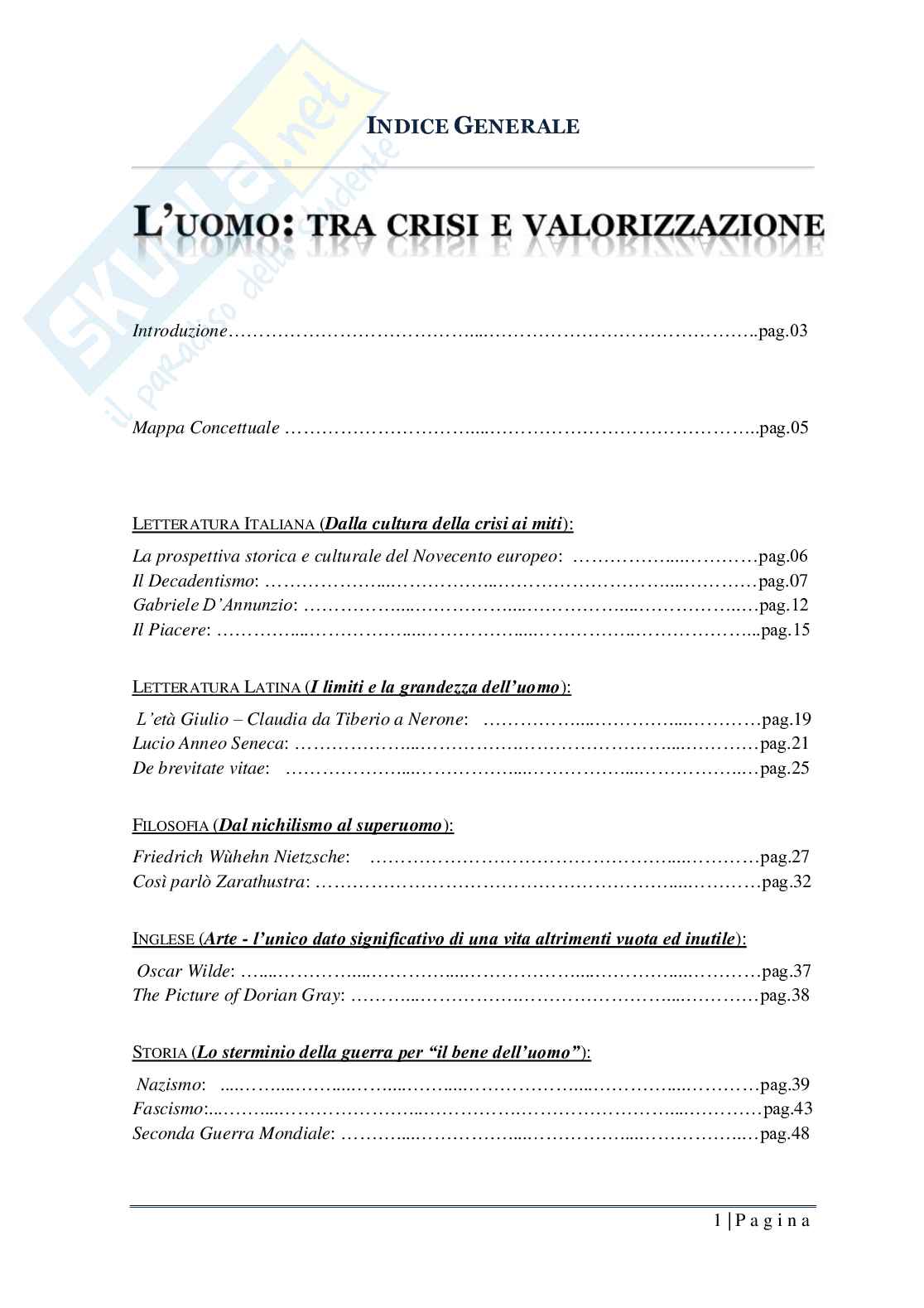 Sommario: Dalla cultura della crisi ai miti, I limiti e la grandezza dell'uomo, Dal nichilismo al superuomo, Arte - l'unico dato significativo di una vita altrimenti vuota ed inutile, Lo sterminio della guerra per "il bene dell'uomo", Conseguenze dell'attività umana sull'ambiente - Tutela dell'aria, Analisi fisica delle onde elettromagnetiche connesse all'uso dei radar, L'uomo: entità fragile e aggressiva nei confronti dell'ambiente, I microrganismi che popolano l'atmosfera, Studio dei batteri azotofissatori, Dai campi elettrici delle onde all'elettrochimica - La Pila, Altra grande innovazione inglese: i Database, Basi delle teorie di Maxwell con l'analisi matematica