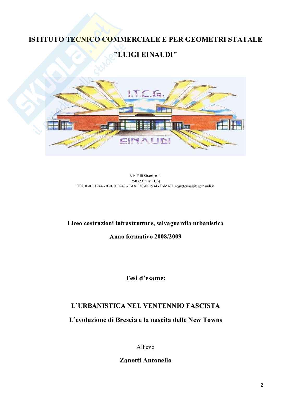Sommario: Architettura-Urbanistica, L'architettura nel ventennio fascista, Razionalismo, Stile Imperiale, Giuseppe Terragni, Marcello Piacentini, la progettazione urbanistica delle citt, gli sventramenti di Brescia, le New towns. Progettazione, il cemento armato. Storia, il fascismo, nascita, sviluppo, caduta, e ideologia del movimento. Topografia, la progettazione stradale, la via Panoramica dei Ronchi a Brescia. Inglese, Carbonia, la New Towns costruita in Sardegna. Diritto-Estimo, l'esproprio per pubblica utilit. Prima e dopo lunit dItalia, i problemi urbanistici delle grandi citt furono affrontati dalle municipalit attraverso disposizioni finalizzate alligiene pubblica e allideale borghese del bello e ordinato. Questi interventi urbanistici coinvolsero principalmente le zone pi antiche dei centri urbani, dove simposero frequenti abbattimenti o addirittura demolizioni totali, per consentire riedificazioni che garantissero la sicurezza statica, rispettassero le distanze minime tra gli edifici e gli allineamenti stradali. I proprietari degli immobili coinvolti in tali interventi difficilmente avrebbero potuto sentirsi penalizzati, perch lesecutivit di un qualsiasi programma di risanamento consentiva loro di allontanare gli affittuari e avvantaggiarsi grazie a premi di cubatura; tutto ci permetteva loro di ricostruire edifici destinati a spazi commerciali e abitazioni, da vendere o affittare a imprenditori o a famiglie borghesi con reddito adeguato allappetibilit degli immobili. Nel 1918, terminata la prima guerra mondiale, le condizioni di vita nelle citt italiane erano al limite del concepibile, ma le risorse del nostro paese, interamente assorbite dallo sforzo bellico, non consentivano di intervenire sul problema degli alloggi. In questa fase di disorientamento emerse il fascismo, un movimento che avrebbe governato il paese fino al 1943 e che avrebbe lasciato un segno nel popolo italiano sia sul piano politico, sia sul piano ideologico e morale. Un movimento sul quale caduta per anni una censura che ha coinvolto anche lurbanistica di quel periodo, infatti, solo da una ventina danni che la storiografia urbanistica e urbana ha dedicato la propria attenzione a questargomento, superando lesclusivo interesse per le epoche antiche. Con questo mio lavoro non intendo colmare le lacune lasciate da studiosi molto pi accreditati di me, ma voglio mettere in luce questargomento affascinante che ha gettato le basi per il futuro sviluppo italiano del secondo dopoguerra.