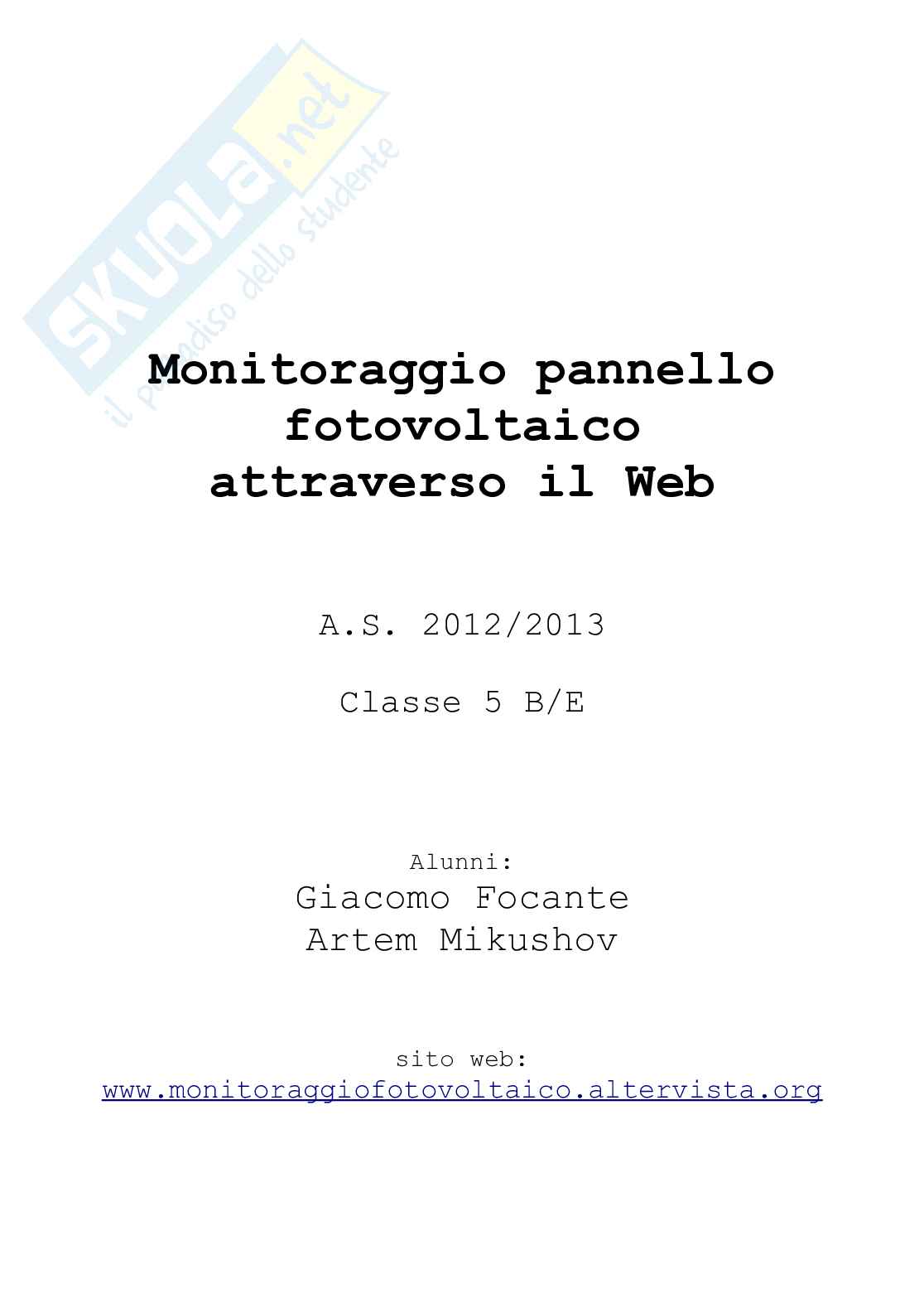 L'idea che voglio analizzare nella mia tesina di maturità è quella di realizzare un impianto composto da vari blocchi (circuito di condizionamento, Arduino) in grado di monitorare un pannello fotovoltaico inviando i valori rilevati, in termini di tensioni e correnti, in un database online tramite un router. Con questa tecnologia è possibile verificare in tempo reale, consultando l'apposita pagina web, la produzione, l'efficienza e il rendimento del pannello fotovoltaico. La tesina permette anche vari collegamenti interdisciplinari.