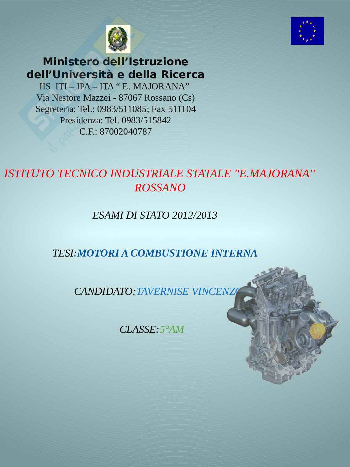 La tesina che ho sviluppato riguarda i motori a combustione interna, ho scelto questo argomento per la tesina di maturità, perché sono appassionato di motori sin dalla mia infanzia. I motori hanno portato una enorme rivoluzione nello sviluppo dell’uomo e hanno migliorato i canoni di vita del genere umano. Quindi per me i motori hanno un’ importanza fondamentale e mi affascinano molto. In questa tesina ho sviluppato il funzionamento dei motori a combustione interna, i motori a quattro e due tempi, i componenti e le loro caratteristiche e tutto ciò che serve per la sua corretta movimentazione.