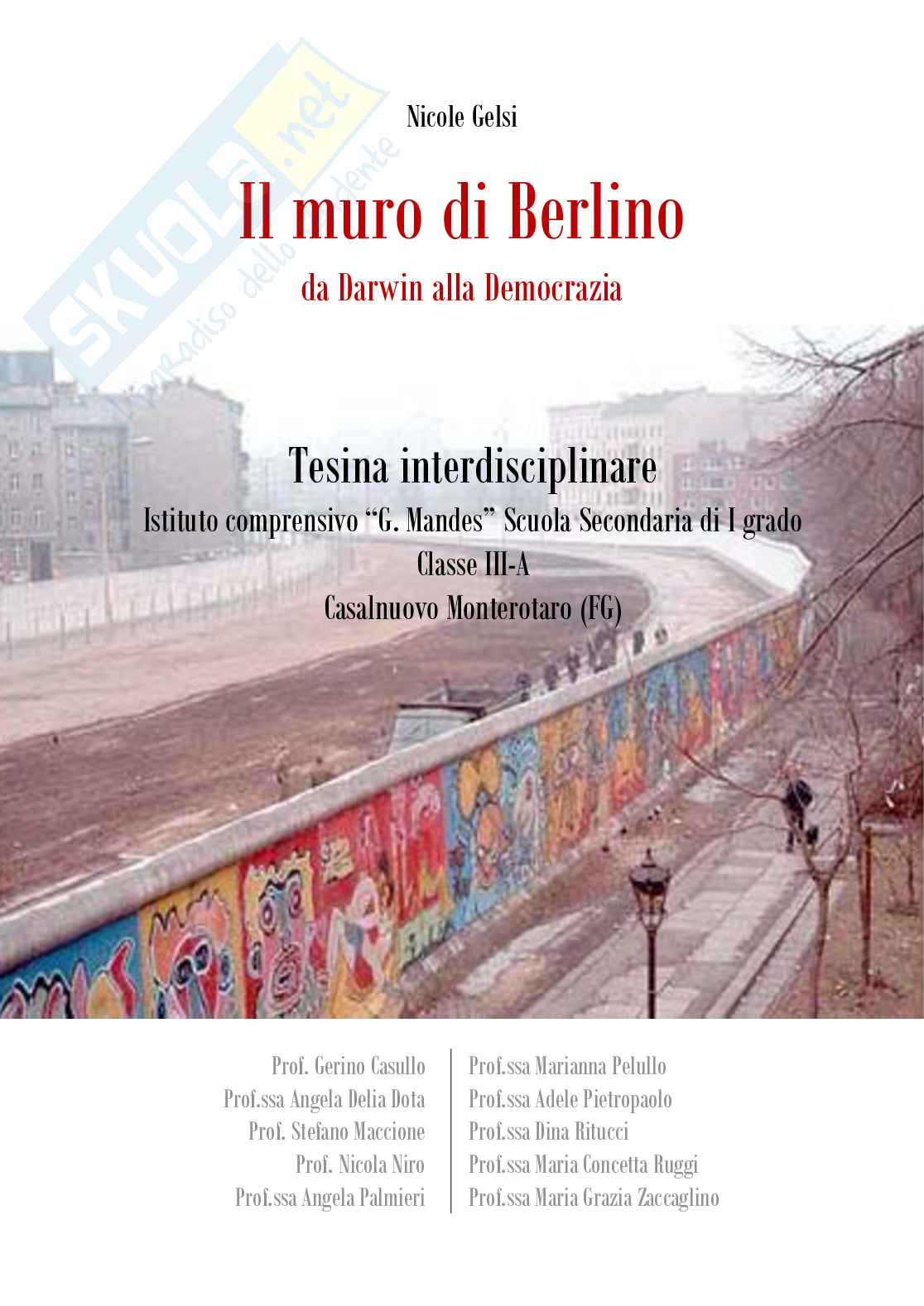 Questa tesina di terza media parla del Muro di Berlino permettendo i seguenti collegamenti interdisciplinari: in Scienze la selezione naturale e Evoluzione genetica, in Storia dalla II Guerra mondiale alla contrapposizione dei due blocchi. Guerra fredda. Costruzione del Muro di Berlino, in Inglese D-Day, lo sbarco in Normandia (in lingua), in Cittadinanza e costituzione dalla Società delle Nazioni all'ONU, in Antologia Kofi Annan, in Educazione Fisica la contrapposizione USA e URSS, Boicottaggio, in Educazione artistica la pop art durante la guerra fredda, in Religione Wojtyla, la cattolica polonia e la crisi comunista, in Francese il ruolo dei mass media nel crollo del muro (in lingua), in Musica Giuseppe Verdi, simbolo del patriottismo e dell'indipendenza dei popoli, in Educazione Tecnica la III rivoluzione industriale, in Geografia l'America.