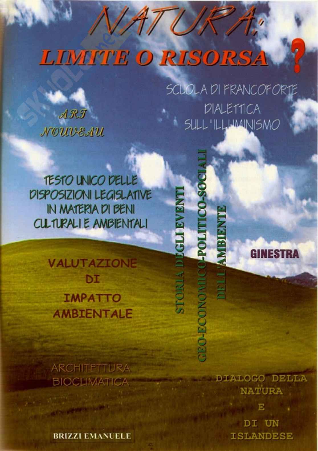 Questa tesina di maturità prende in esame la natura, analizzandola in una duplice visione: limite o risorsa. Gli argomenti che la tesina affronta sono: in Italiano Ginestra di Leopardi, Dialogo della natura e di un islandese, in Filosofia la Scuola di Francoforte e la Dialettica dell'Illuminismo, in Storia la storia degli eventi geo-economico-politico-sociali dell'ambiente, in Inglese l'art nouveau, in Rilievo architettonico l'architettura bioclimatica, in Estimo la valutazione di impatto ambientale, in Diritto il Testo unico delle disposizioni legislative in materia di beni culturali e ambientali.