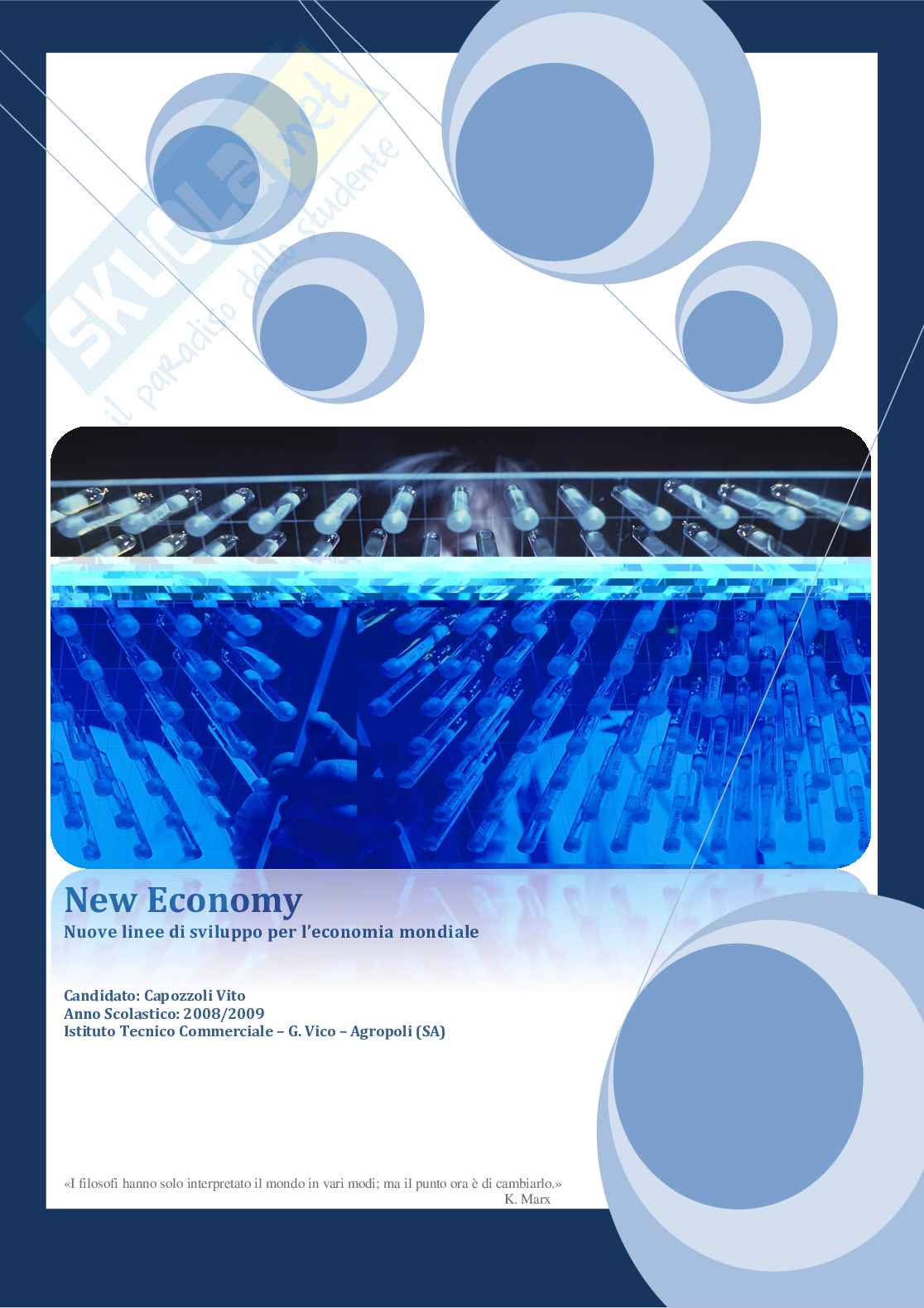 Descrizione: La New Economy si può definire come l'insieme dei molteplici cambiamenti qualitativi e quantitativi che, durante gli ultimi 15 anni, hanno trasformato la struttura, le funzioni e le regole dell'economia. La New Economy, quindi, può essere semplicemente ma efficacemente intesa come una nuova tecnica commerciale alla cui base vengono interposte le tecnologie informatiche e più in particolare Internet, la rete informatica internazionale per eccellenza, che appunto rappresentano esplicitamente gli strumenti essenziali per svilupparla.