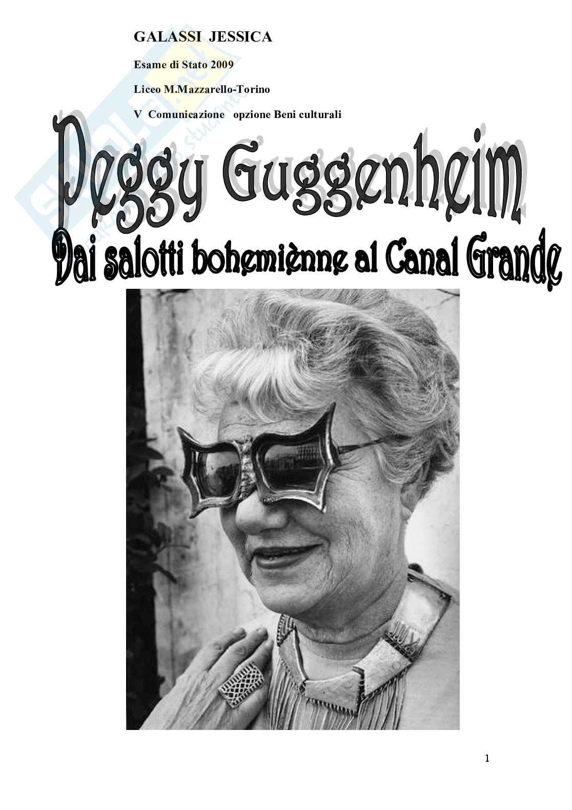 Sommario:1. La vita pag.4 2. In Europa: i salotti bohémienne pag.6 3. Londra: Guggenheim Jeune pag.8 4. La fuga dalla guerra pag.15 5. Ritorno negli USA pag.17 6. Art of this century pag.19 7. Jackson Pollock pag.22 8. Peggy a Venezia pag.29 9.Peggy Guggenheim Collection pag.32 Conclusione pag.33