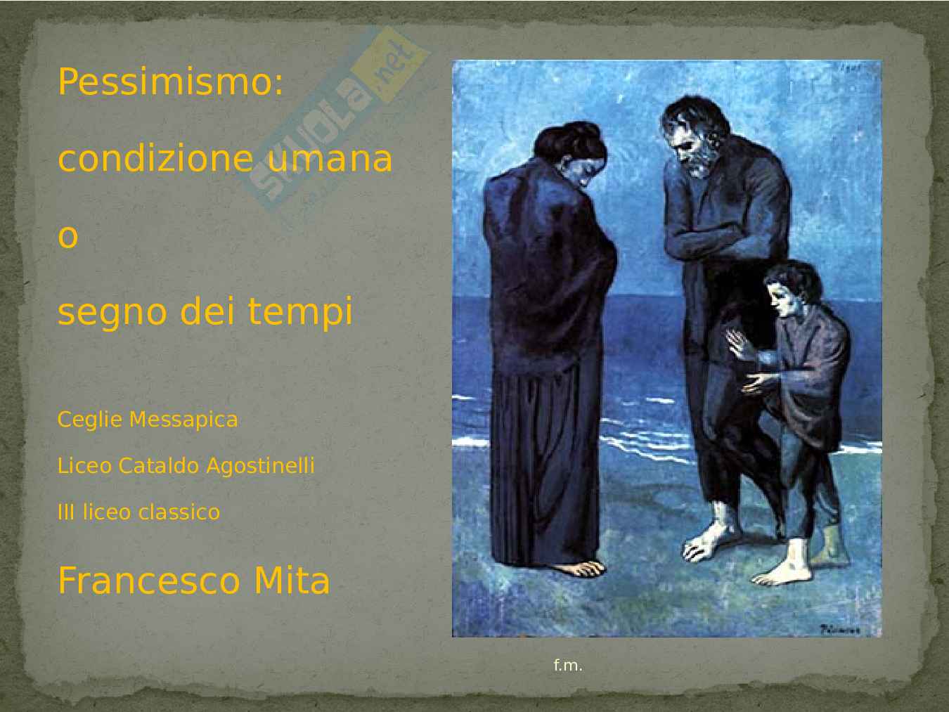 In questa tesina ho trattato il tema del pessimismo nella letteratura greca,latina,italiana, francese, in filosofia, nelle arti:pittura e musica, ed anche in storia ed astronomia. L’idea di scrivere una tesina di maturità sul pessimismo con l’esplorazione delle varie manifestazioni di pensiero ed artistiche succedutesi nel corso degli anni dalla antica Grecia, agli autori latini passando per la filosofia, la letteratura e la pittura fino alla musica moderna, forse la massima espressione poetica dei nostri giorni, nasce dall’ascolto di brani musicali recenti e meno recenti con denominatore comune la visione pessimistica della vita e dal conseguente quesito sulla sua origine, ovvero si nasce pessimisti, e quindi si ha una visione pessimistica della propria esistenza, o si diventa per le condizioni sociali del tempo in cui si vive? Non potevo trovare migliore copertina del quadro: Passeggiata in riva al mare di Picasso, dove alle tinte scure dei soggetti ed allo sfondo che sembra essere un tutt’uno indistinto, cielo,mare e terra si può osservare la postura degli stessi, dimessa, sofferente, ritirata dove non ci sono sguardi che si incrociano quasi a testimoniare l’incomunicabilità e la sofferenza dei soggetti.