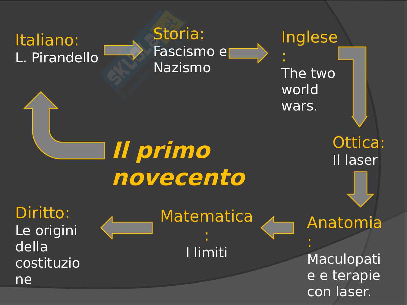 La seguente tesina mostra quali siano stati i grandi eventi e cambiamenti del primo Novecento, partendo dall'analisi del pensiero di Luigi Pirandello in ambito letterario. Gli argomenti che questa tesina di maturità presenta sono: il fascismo e il nazismo in Europa, la Seconda Guerra mondiale, il laser, le maculopatie e le terapie con laser, i limiti in ambito matematico e infine le origini della Costituzione italiana.