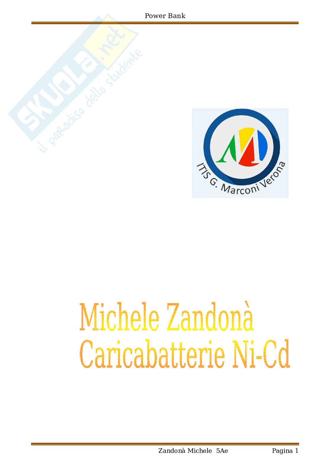 Questa tesina descrive il progetto di un caricabatterie Ni-Cd. Questo dispositivo (comunemente chiamato Power bank), ci consente di caricare pacchi batterie portatili formati da diverse pile i quali una volta caricati e portati in viaggio consentono di ricaricare diversi dispositivi come ad esempio cellulari, macchine fotografiche, dove non c’è la possibilità di un allacciamento alla rete elettrica. Solitamente erogano una tensione di 5V DC e hanno una capacità che varia in base ai tipi di modello(da 500 a 3000mAh). La tesina permette dei collegamenti con due materie.