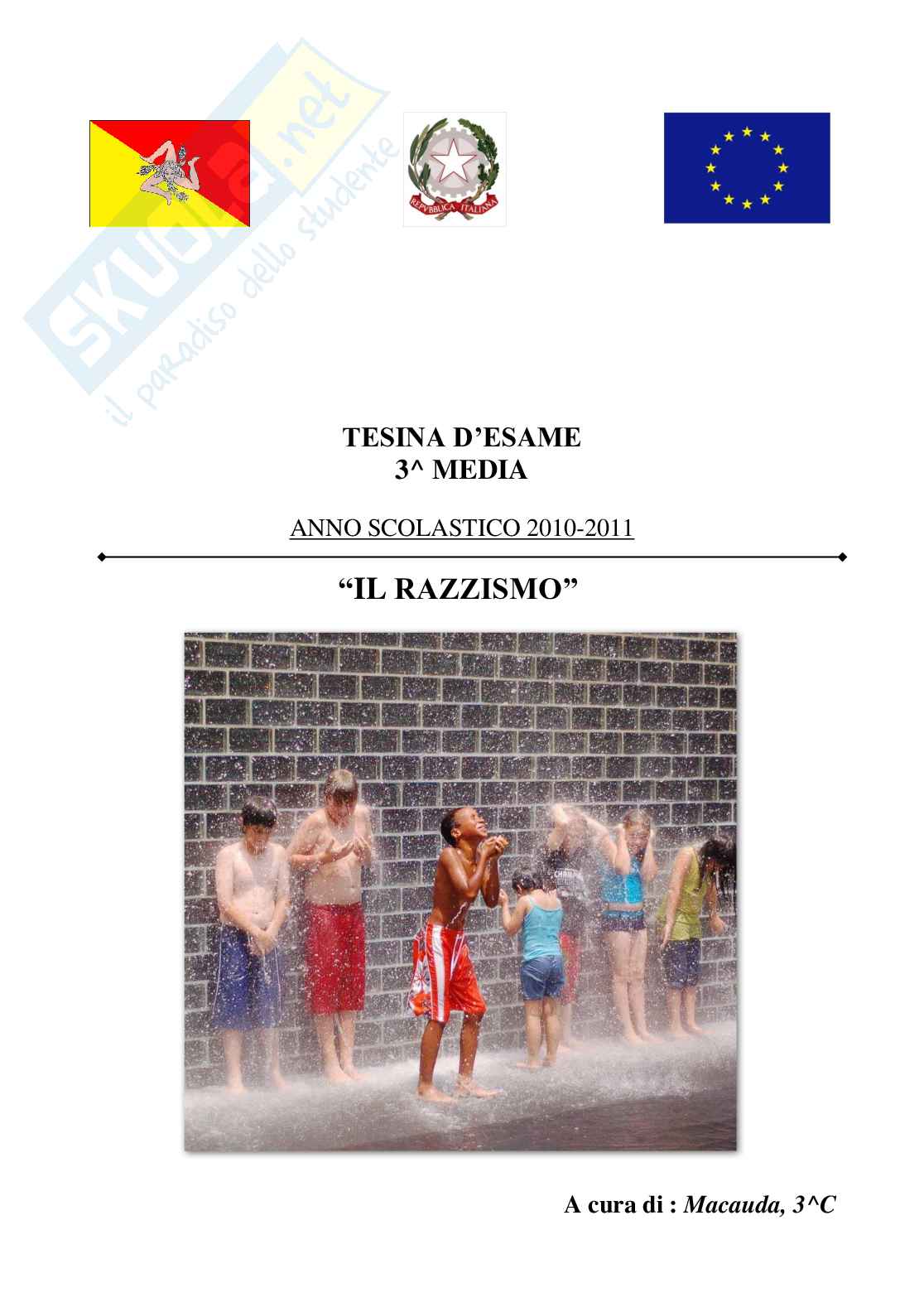 Questa tesina di terza media descrive il razzismo. L'argomento è collegabile, nella tesina, con i seguenti argomenti: in Antologia il razzismo; Martin Luther King, I have a dream, in Letteratura vita e opere di Primo Levi; “Se questo è un uomo”, in Storia il nazismo, in Educazione alla cittadinanza l’Italia repubblicana; Costituzione italiana; Ordinamento dello Stato, in Geografia la Germania, in Inglese the Racism, in Francese Sos Racisme; Les droits de l’homme, in Musica la musica leggera e la musica in Italia, in Storia del'arte Pablo Picasso, Guernica, in Narrativa Immigrazione e Razzismo, in Scienze i vulcani, in Educazione fisica lo scheletro, le articolazioni, i muscoli, in Educazione tecnica la produzione e trasformazione dell’energia, le centrali elettriche, le macchine in uso nelle centrali elettriche e la centrale termonucleare.
