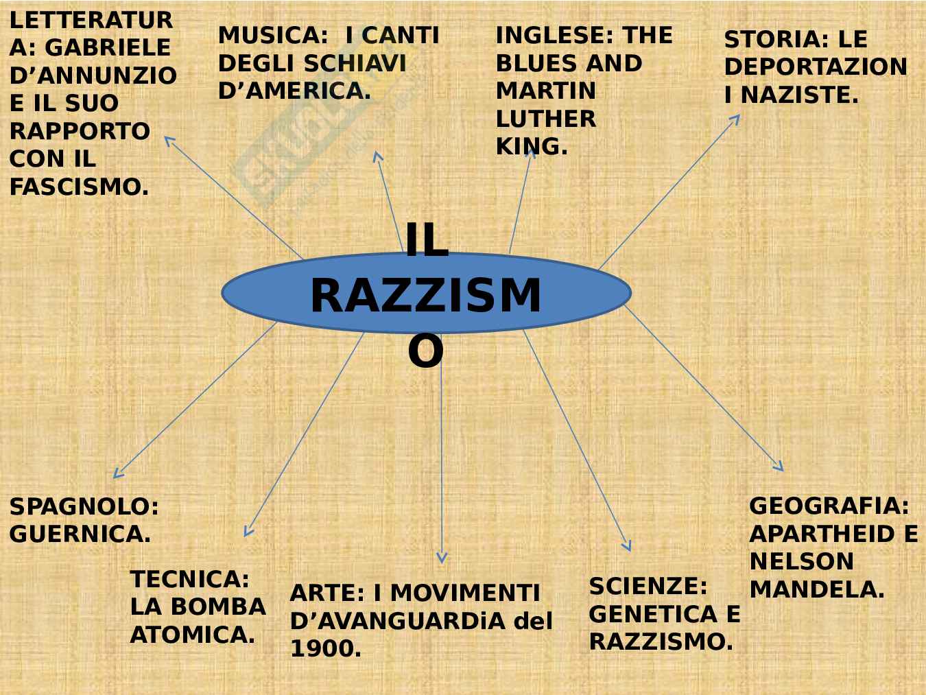 La seguente tesina di terza media è quello di analizzare il tema del razzismo, effettuando vari collegamenti interdisciplinari. In Italiano viene spiegato il rapporto tra Gabriele D'Annunzio e il fascismo, in Storia vengono invece descritte le vicende che hanno contrassegnato la vita di milioni di persone innocenti, ovvero le deportazioni naziste ai danni soprattutto degli ebrei.