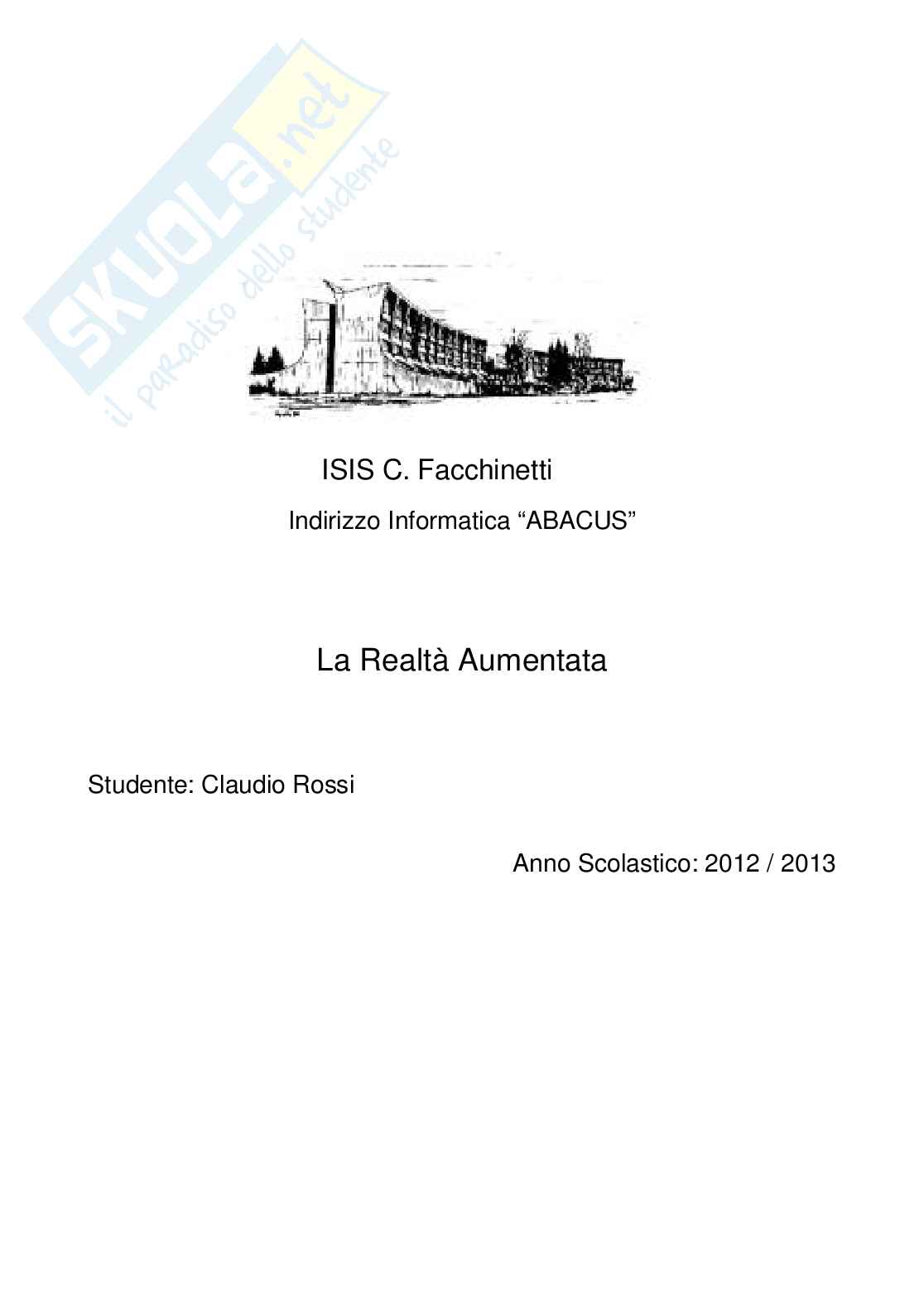 In questa tesina verranno illustrati gli aspetti principali di questa tecnologia ancora in fase di sviluppo analizzandone il funzionamento e i campi in cui può essere applicata e anche come essa si sia evoluta nel tempo. Vista la sua facilità di implementazione, questa tecnologia sta emergendo e si sta sviluppando sempre più, infatti aziende importanti stanno investendo in questo campo, un esempio sono i Google Glasses, realizzati dalla rinomata azienda, contribuiranno a portare la realtà aumentata nella vita di tutti i giorni. Oltre agli utilizzi elencati in precedenza, vi sono anche altri progetti in via di sviluppo che una volta realizzati porteranno grosse innovazioni in vari campi tra cui quello dell’ingegneria e della progettazione meccanica. Naturalmente affinché tutto questo si realizzi è necessaria la motivazione, ma anche dei fondi adeguati per favorire i ricercatori nell’impresa. La tesina di maturità descrive l'argomento prendendo in consdiderazione le materie di Informatica e di Sistemi.