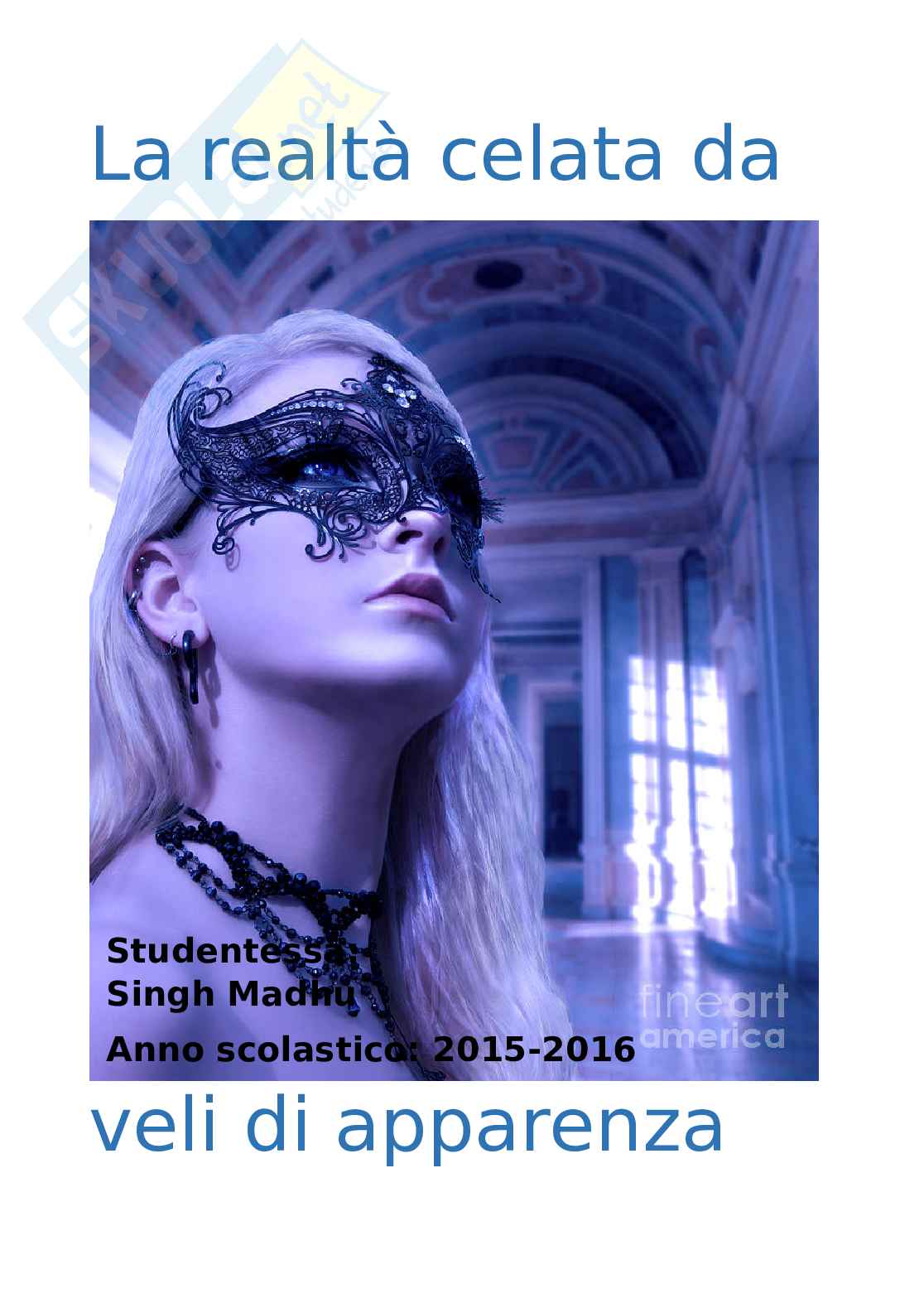 Ho scelto il tema della maschera come filo conduttore di questa tesina di maturità, perché ritengo che ogni uomo sia costretto a indossarne ogni giorno davanti agli altri. La maschera fu lo strumento più utilizzato nel teatro antico dagli attori ed era il mezzo che consentiva loro di volta in volta di interpretare diversi personaggi, anche ognuno di noi nella vita quotidiana indossiamo maschere, coincidenti con i diversi ruoli sociali che andiamo a ricoprire, assumendo, di conseguenza, differenti schemi di comportamento. È, dunque questo un mezzo di alienazione dalle “richieste” delle società moderna e dai ruoli che ognuno di noi sarebbe chiamato a ricoprire perdendo di vista se stesso e la propria identità. Carl Gustav Jung nelle sue formulazioni sui temi universali dell’inconscio collettivo individuò in quello che chiamò persona, nel senso etimologico di maschera, quel ruolo o copione che ognuno svolge in determinate circostanze, per rispondere alle richieste del mondo esterno. Un’eccessiva rigidità della persona e, quindi, della maschera corrisponde a una eccessiva identificazione con essa. Adottare in maniera flessibile e non rigida una maschera per poter uscire e rientrare nei diversi ruoli sociali esprime coerenza e continuità. Indossare una maschera è anche e soprattutto una metafora per distinguere i diversi tipi di atteggiamenti che ognuno di noi ha in contesti e in situazioni di vita diversi. Si può indossare la maschera dell’impiegato, quello da studentessa, da professoressa. Mostrando lati diversi della nostra personalità o impersonando ruoli che consciamente o inconsciamente decidiamo di interpretare nel grande palcoscenico del mondo. La tesina permette vari collegamenti con le materie scolastiche.
