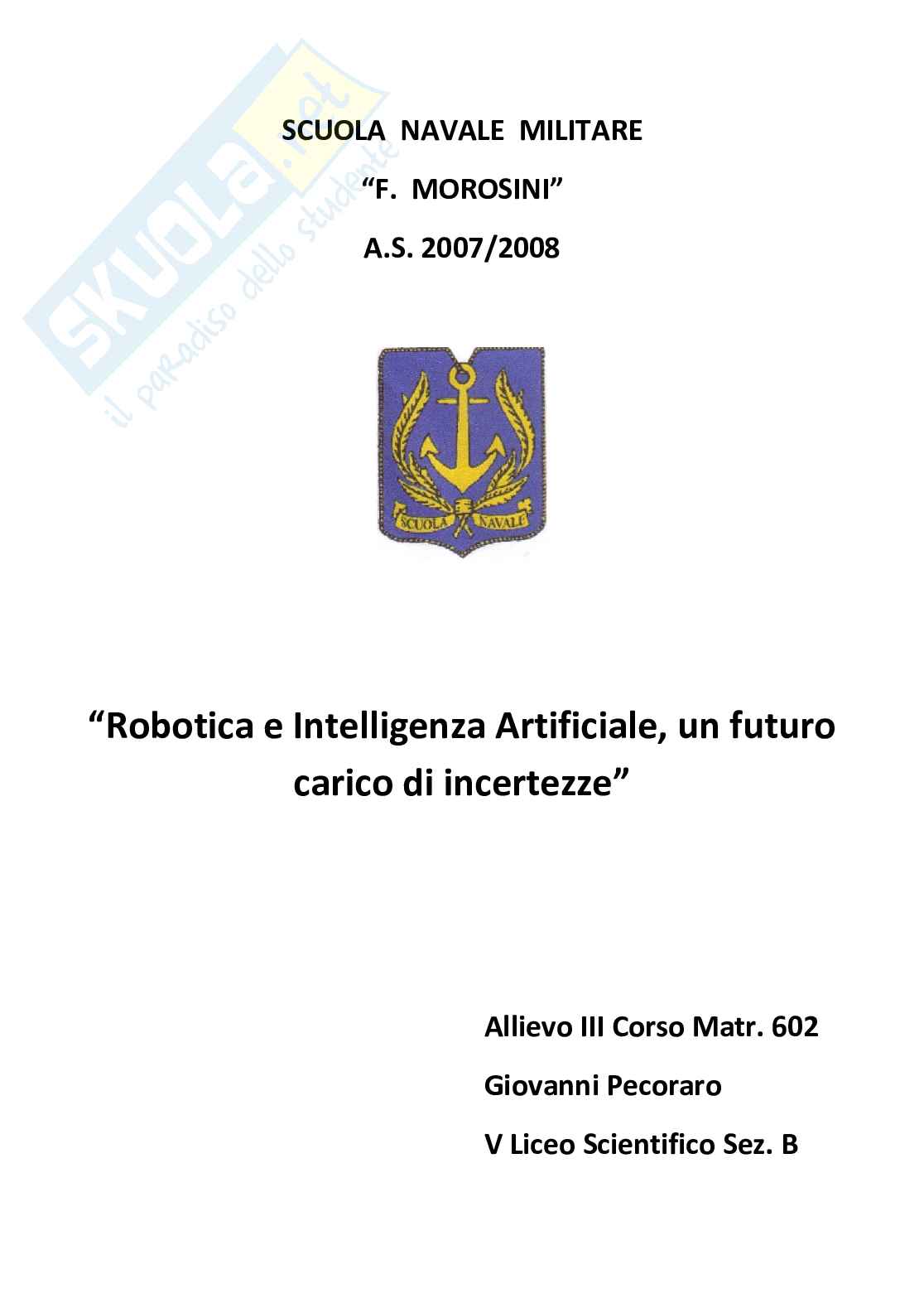 Sommario: Nel realizzare questo elaborato in vista del mio esame di maturità ho tentato di infondere nelle poche righe la mia innata passione per la scienza. Da tempo ho sviluppato l'idea che qualsiasi fenomeno legato alla natura sia riconducibile ad un insieme di leggi fisico-matematiche. Ricordando le parole del filosofo inglese Thomas Hobbes affermo con estrema convinzione che allo stesso modo ogni processo che coinvolge la ragione umana è razionalizzabile in una specifica equazione. Persino un sentimento astratto come l'amore, la vera essenza dell'irrazionalità , può essere ricondotto ad una formula fisica basato su un linguaggio matematico a tal punto sopraffino e complicato da essere incomprensibile all'uomo moderno. Noi siamo ancora troppo legati ai classici modelli matematici, che risalgono ai tempi delle civiltà mesopotamiche. Per quanto possiamo svilupparli, questi rappresentano pur sempre un limite. Magari un giorno un novello Gauss, privato di ogni insegnamento scolastico, riuscirà autonomamente a sviluppare fin da bambino una nuova e più libera matematica, che ci permetterà di risolvere dilemmi che attualmente sembrano insolubili. Attraverso una prima parte esclusivamente teorica ed una seconda applicativa ho provato a riassumere quelli che sono stati gli enormi, ma purtroppo ancora limitati, sviluppi della Robotica e dell'Intelligenza Artificiale nell'ultimo secolo. Sono queste le scienze del futuro, quelle su cui è opportuno investire tempo e denaro, tenendo sempre sott'occhio il lato perverso della mente umana, una realtà così meravigliosa, ma allo stesso tempo capace di trasformare la bellezza innata della scienza in uno strumento di morte e distruzione.La tesina contiene una descrizione dei principi basilari dell'intelligenza artificiale, legati ad una sezione pratica in cui si analizza il funzionamento di un robot dotato di un dispositivo line follower. Il programma allegato invece vuole essere un semplice esempio delle potenzialità delle strutture intelligenti nelle operazioni di problem solving.