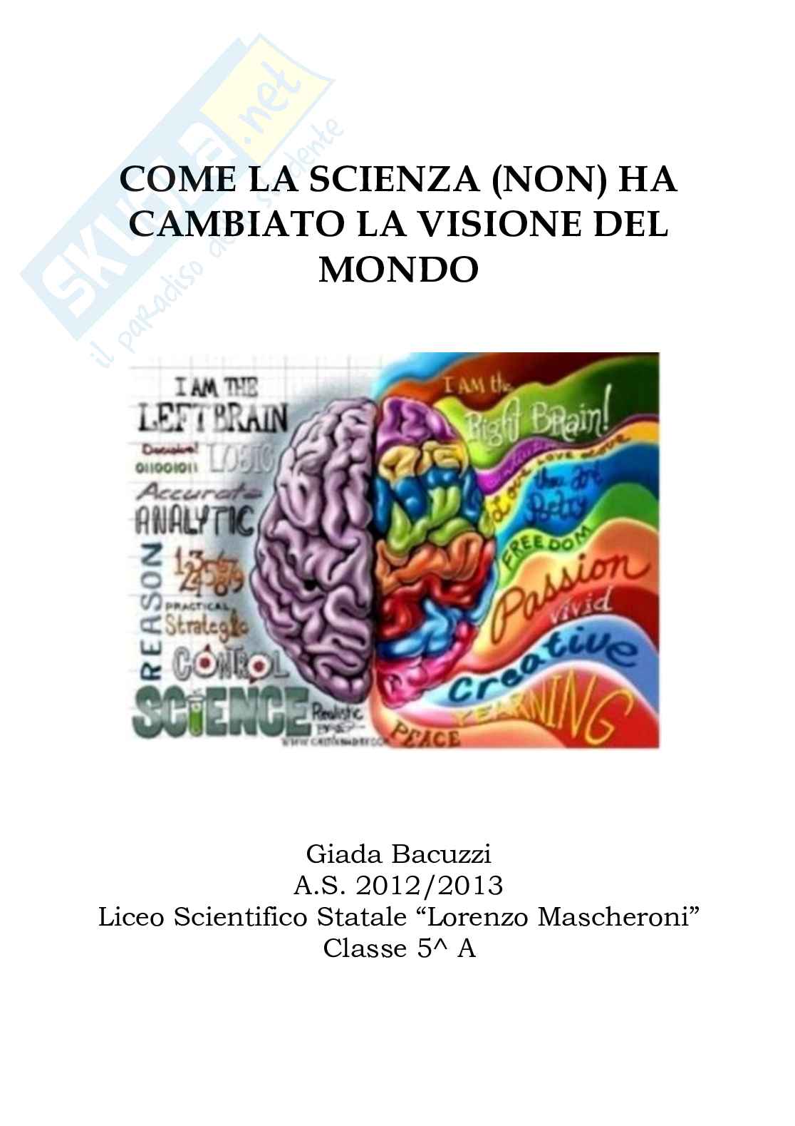 Ho scelto di intitolare questa tesina di maturità “Come la scienza (non) ha cambiato la visione del mondo” perché il mio intento, in queste pagine, è di illustrare come al progresso scientifico non abbia fatto eco un altrettanto grande progresso in campo umano. La mia non vuole essere una critica al fatto che le domande esistenziali (chi siamo, perché) siano ancora aperte. Non cerco giustificazioni del perché non abbiamo ancora risolto i quesiti ultimi dell’esistenza umana, ma tento di comprendere come mai siano ancora in piedi visioni del mondo vetuste, inattuali e a volte senza fondamento. Mi interrogo sull’esistenza di un mondo a due velocità, con un sapere sulla natura, sul cosmo, proprie del XXI secolo, ma in cui sopravvivono concezioni per certi versi anteriori al Medioevo. Mi domando,