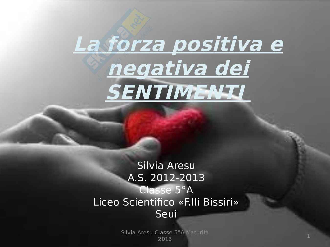 In questa tesina di maturità vengono descritti i sentimenti, con attenzione agli aspetti positivi e a quelli negativi di questi. La tesina sviluppa anche i seguenti argomenti: in Storia dell'arte Amore e Psiche (Amore), in Storia le leggi razziali (Odio), in Filosofia la teoria del dolore di Schopenhauer (Dolore), in Italiano "A Silvia" di Leopardi (Nostalgia), in Scienze i terremoti(Paura), in Francese Rimbaud e Verlaine (Gelosia), in Latino Indignatio di Giovenale (Indignazione)e in Inglese "The Daffodils" di Wordsworth (Serenità).