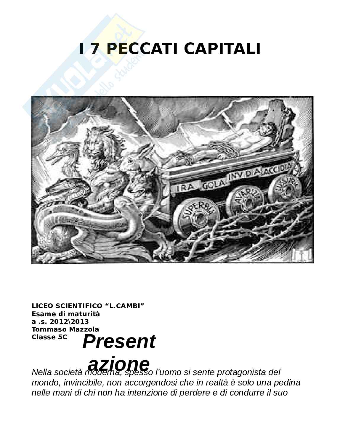 Nella mia tesina analizzo i sette peccati capitali. Nella società moderna, spesso l’uomo si sente protagonista del mondo, invincibile, non accorgendosi che in realtà è solo una pedina nelle mani di chi non ha intenzione di perdere e di condurre il suo gioco, di chi tende a guardare gli altri prima di se stesso, puntando il dito, accusando e condannando senza diritto di appello; il peccato nasce allora dalle convinzioni sbagliate che l’essere umano considera ed accetta come giuste.