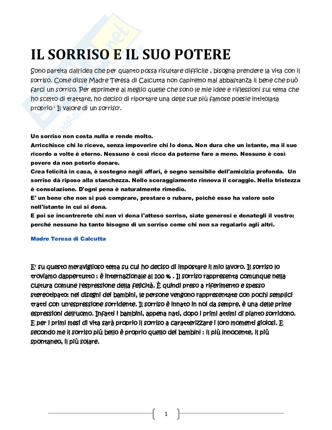 Sono partita dall'idea che per quanto possa risultare difficile , bisogna prendere la vita con il sorriso. Come disse Madre Teresa di Calcutta non capiremo mai abbastanza il bene che può farci un sorriso. Per esprimere al meglio quelle che sono le mie idee e riflessioni sul tema che ho scelto di trattare nella mia tesina, ho deciso di riportare una delle sue più famose poesie intitolata proprio "Il valore di un sorriso". E' su questo meraviglioso tema su cui ho deciso di impostare la mia tesina di maturità. Il sorriso lo troviamo dappertutto: è internazionale. Il sorriso rappresenta comunque nella cultura comune l'espressione della felicità. È quindi preso a riferimento e spesso stereotipato: nei disegni dei bambini, le persone vengono rappresentate con pochi semplici tratti con un'espressione sorridente. Il sorriso è innato in noi da sempre, è una delle prime espressioni dell'uomo. Infatti i bambini, appena nati, dopo i primi attimi di pianto sorridono. E per i primi mesi di vita sarà proprio il sorriso a caratterizzare i loro momenti gioiosi. E secondo me il sorriso più bello è proprio quello dei bambini : il più innocente, il più spontaneo, il più solare. La tesina mostra come l'argomento del sorriso si può anche approfondire in altre materie scolastiche.