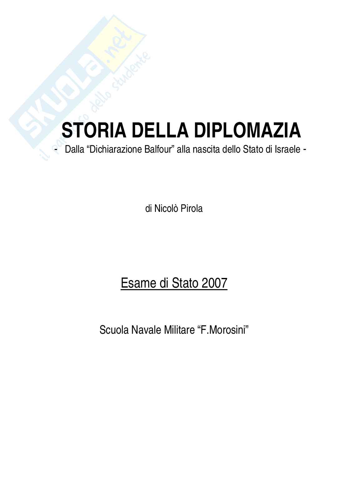 La tesina concerne una breve storia delle relazioni diplomatiche, con particolare attenzione all'atto della dichiarazione Balfour che portò alla nascita dello Stato di Israele, citando le strutture diplomatiche di ONU e NATO.