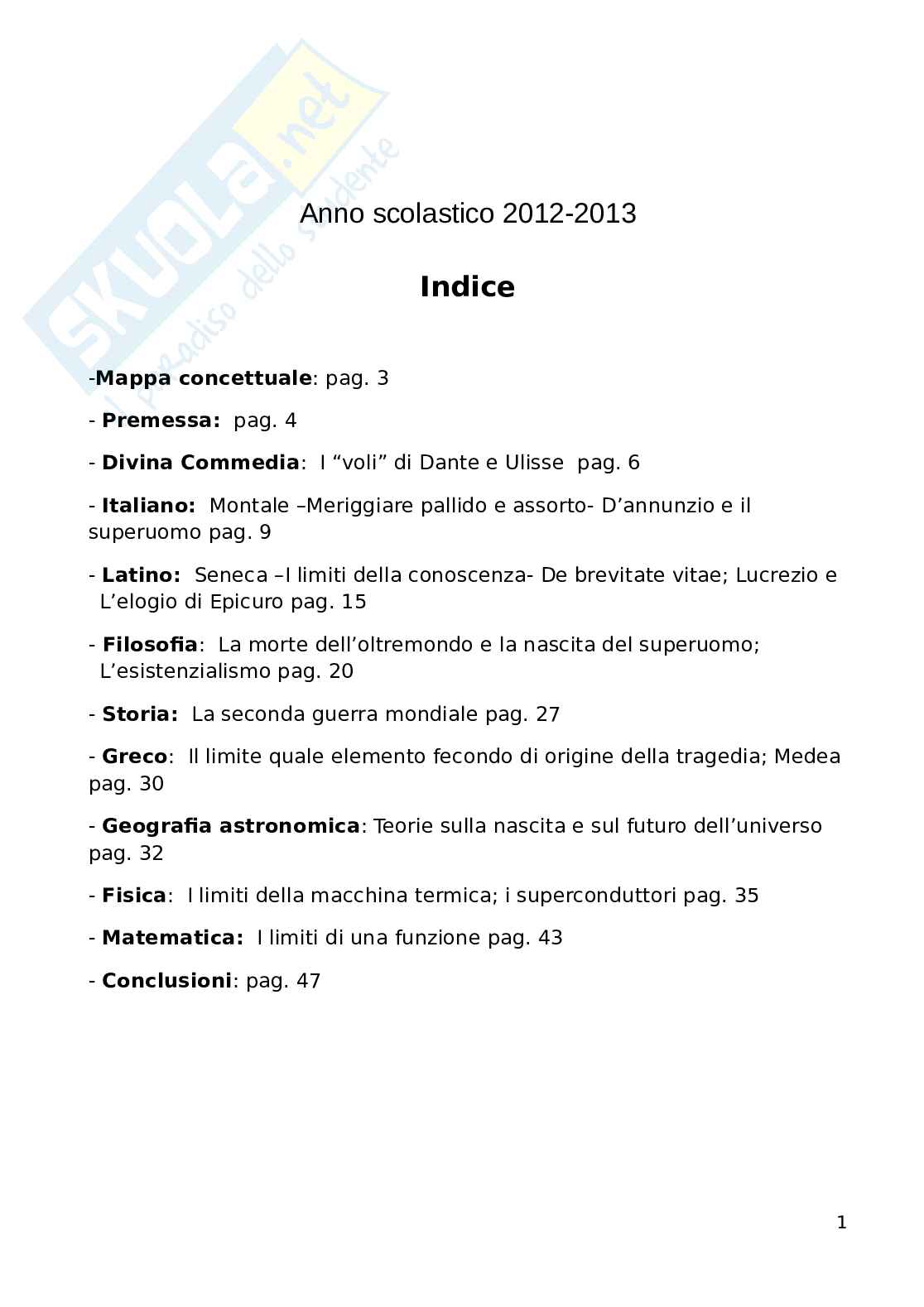 La seguente tesina di maturità ha quale obiettivo quello di descrivere i limiti dell'essere umano e la figura del superuomo. Da sempre il "limite" di noi stessi ha dato ispirazione per la fantasia. Attraverso i personaggi delle grandi saghe epiche e attraverso le figure dei grandi supereroi, ci si rende contro del fatto che essi siano il frutto delle nostre paure. la paura sta nell’eterna consapevolezza del ‘limite’ tutto il mistero della vita dell’uomo. È costruito su questa parola che sembra contenere in sé tutto l’enigma del nostro esistere. La stessa etimologia di tale termine racconta tutta la ‘sacralità’ che questo concetto reca in sé. I romani indicavano con il vocabolo ‘limiti’ quelle pietre che segnavano i confini, le quali erano sacre e non potevano rimuoversi senza delitto, essendo sotto la speciale protezione di una divinità detta ‘Limite’ o ‘Termine’. Quest’ultimo quindi, è qualcosa di intoccabile, talmente connaturato alla nostra natura umana da non poter essere rimosso senza danno alla natura umana stessa. Non ha una sua piena realizzazione concreta. Nella sua astrattezza indica il fattore di cui possiamo cogliere solo le conseguenze, mai l’origine o qualsiasi forma, sia pur lontana, di ‘incarnazione’ e quindi di materializzazione dello stesso. Il ‘limite’ è un concetto archetipico, frutto della stessa finitudine dell’uomo. A lui preesiste, in quanto ne determina l’orizzonte di vita e la sua pedagogia ci riporta alla concezione della nostra essenza di uomini. Disponiamo nello spazio della vita di un tempo e un limite. Nella stessa misura, però, abbiamo infinite possibilità di giocarci il nostro tempo e il nostro limite. Nello stesso momento, però, la nostra mente ha come limite alla sua capacità di immaginare quella della nostra percezione. La nostra capacità di immaginazione in sostanza trova un limite nel fatto che siamo capaci di ‘fantasticare’ solo nel limite degli oggetti a disposizione dei nostri sensi. Quando ‘immaginiamo’ qualcosa non facciamo altro che ‘ricombinare’ elementi del nostro percepito quotidiano. Come paradosso se riuscissimo a concepire qualcosa di infinitamente diverso da ciò che possiamo vivere quotidianamente dovremmo arrenderci, comunque, di fronte al limite intrinseco della sua incomunicabilità.