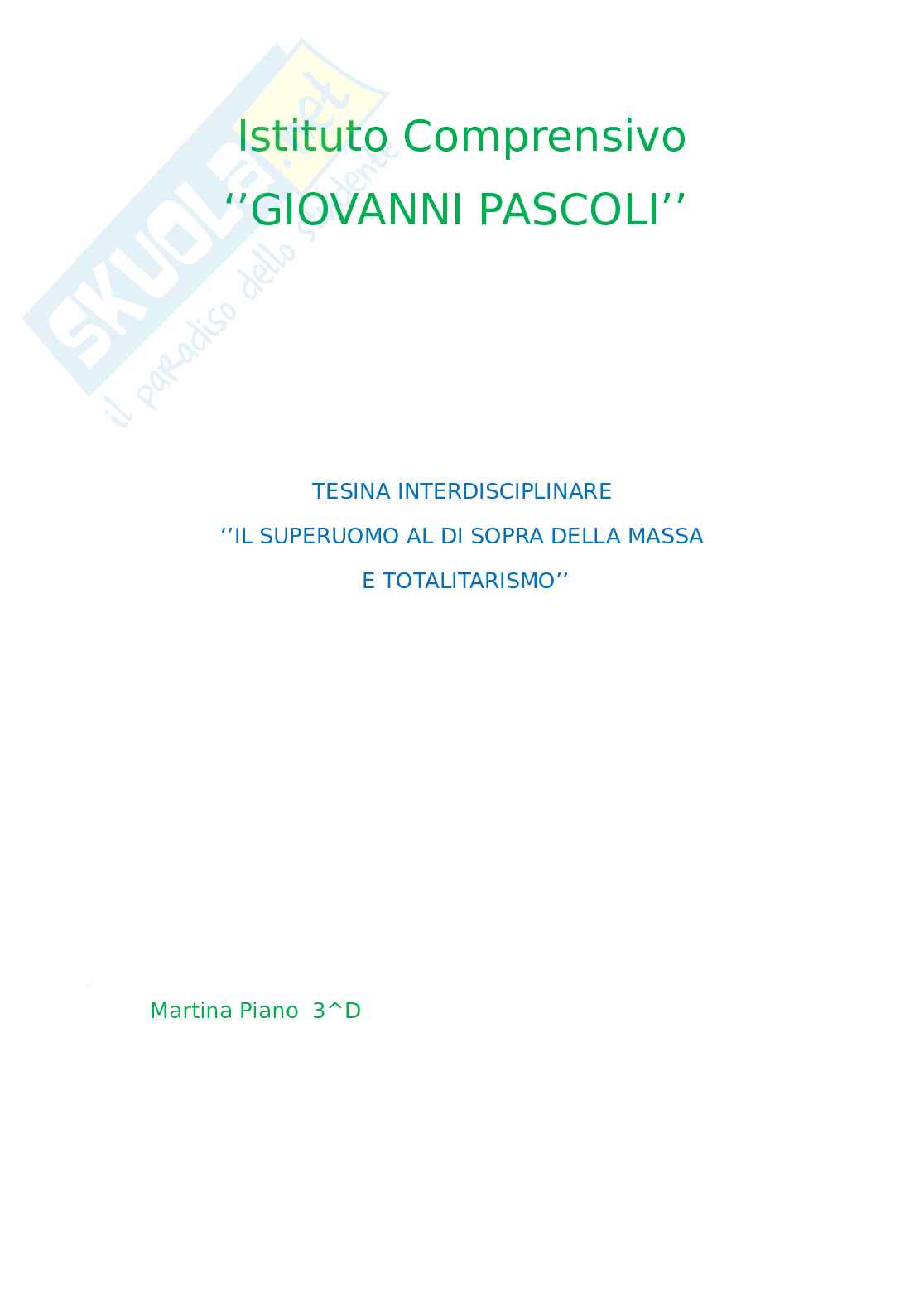 Nella seguente tesina viene analizzato il tema del superuomo, la cui figura viene chiaramente delineata dallo scrittore Gabriele D'Annunzio. Un'altra analisi è quella del decadentismo, movimento letterario che ebbe un grande sviluppo in tutto il Continente europeo. In Storia invece viene effettuata un'analisi sul movimento fascista, esempio di totalitarismo che prese piede in Italia a partire dagli anni Venti del 1900.