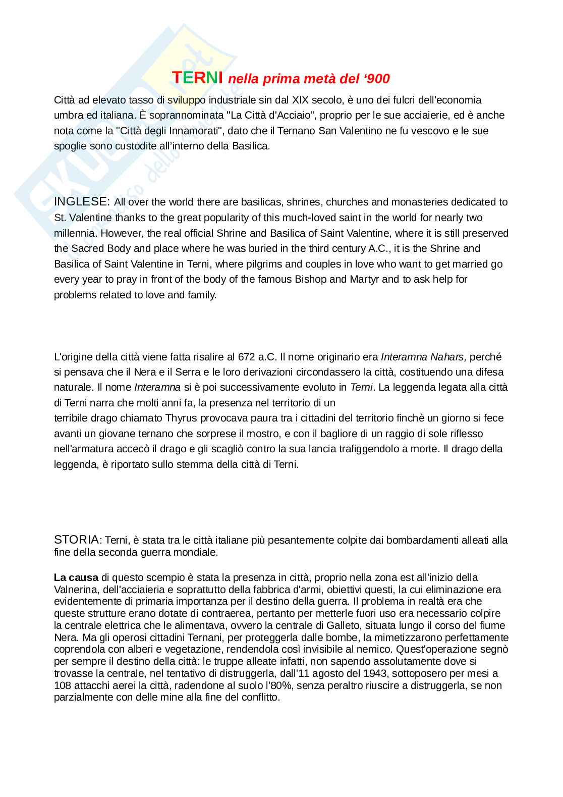 Questa tesina ha come obiettivo quello di descrivere la città di Terni nel corso della prima metà del 1900. La città viene descritta nella tesina di maturità, effettuando dei collegamenti con le varie materie scolastiche. Città ad elevato tasso di sviluppo industriale sin dal XIX secolo, è uno dei fulcri dell'economia umbra ed italiana. È soprannominata "La Città d'Acciaio", proprio per le sue acciaierie, ed è anche nota come la "Città degli Innamorati", dato che il Ternano San Valentino ne fu vescovo e le sue spoglie sono custodite all’interno della Basilica.