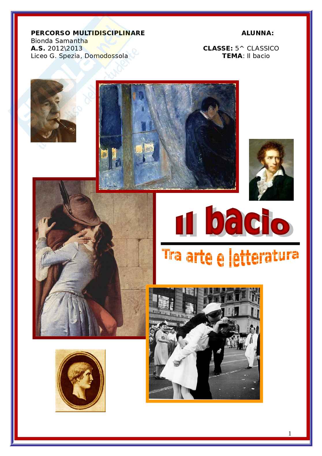 I Maori, in Nuova Zelanda, così come gli Eschimesi, usano strofinare i nasi rimanendo fronte contro fronte come tenera effusione e per anni quest’usanza è stata saluto ufficiale; in Kenya addirittura i baci sono vietati e considerati atti impuri. Artisti e scrittori hanno raccontato, tra le svariate tematiche, il bacio nelle loro opere (anche distaccandosi dalla semplice tradizione amorosa) in certi casi anche disprezzandolo (Marziale) o lasciandosi trasportare da pensieri macabri a riguardo (I. U. Tarchetti, E. Munch); è diventato pretesto per una parentesi felice nel mezzo di romanzi (U. Foscolo), sfondo di un’allegoria storico-politica (F. Hayez) oppure semplice descrizione del nascere o dell’affermarsi di un amore giovanile (U. Saba in Italia, J. Prévert in Francia. La tesina quindi tratta del tema del bacio, effettuando un viaggio tra arte e letteratura.