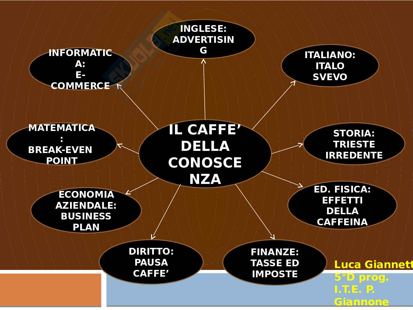 La seguente tesina di maturità descrive il caffè, collegandolo con i seguenti argomenti: l'e-commerce in informatica, l'advertising in Inglese, la pausa caffè in Diritto, il business plan in Economia aziendale, il break-even point in Matematica, le tasse e le imposte in Scienze delle finanze. La tesina continua con l'analisi di questi temi: Italo Svevo in Italiano, Trieste irredente in Storia e infine l'effetto della caffeina in Educazione fisica.