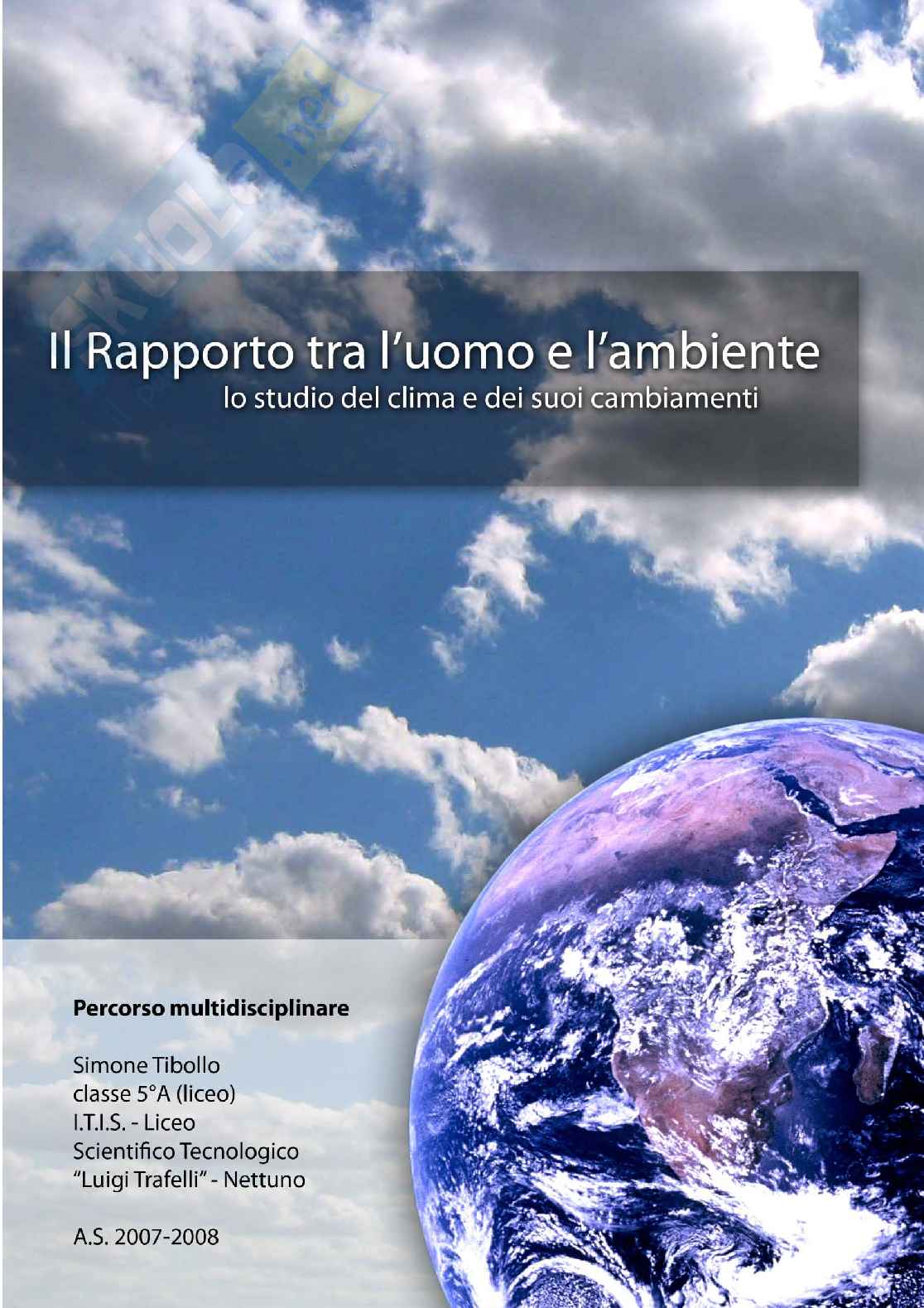 L'obiettivo di questa tesina di maturità è quello di descrivere il cambiamento climatico."Tempo meteorologico" e "clima" sono due termini che nel linguaggio comune vengono spesso confusi; dal punto di vista scientifico invece, i loro significati sono ben distinti. Il tempo meteorologico è la risultante di molti fattori riferita ad un'area definita e limitata in un determinato intervallo di tempo. Il clima invece si definisce soprattutto sulla base di elementi costanti che tendono a ripetersi stagionalmente; si riferisce inoltre ad ambienti molto vasti (ad esempio, le fasce climatiche comprendono parti molto estese di più continenti). Esso dipende da determinati elementi e fattori climatici.