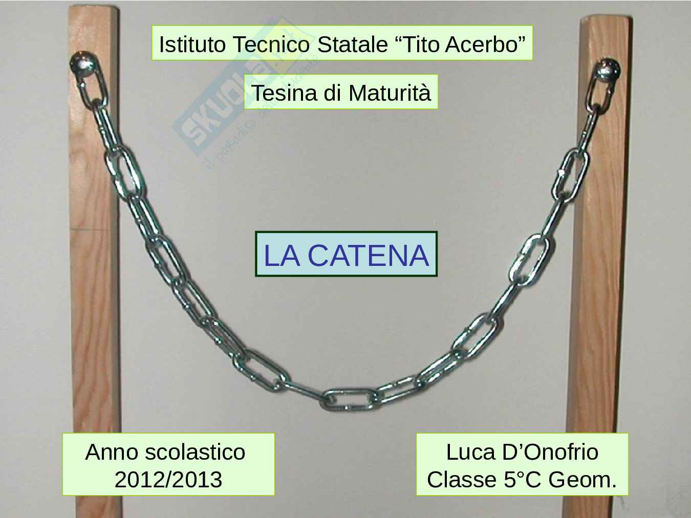 La tesina prosegue, prendendo in esame i seguenti argomenti: la regola di derivazione di una catena in Matematica, l'arco catenario e il suo uso in Gaudì, in Costruzioni viene analizzata la catena come elemento usato in edilizia e infine in Impianti viene analizzata la legge di continuità e il teorema di Bernoulli.